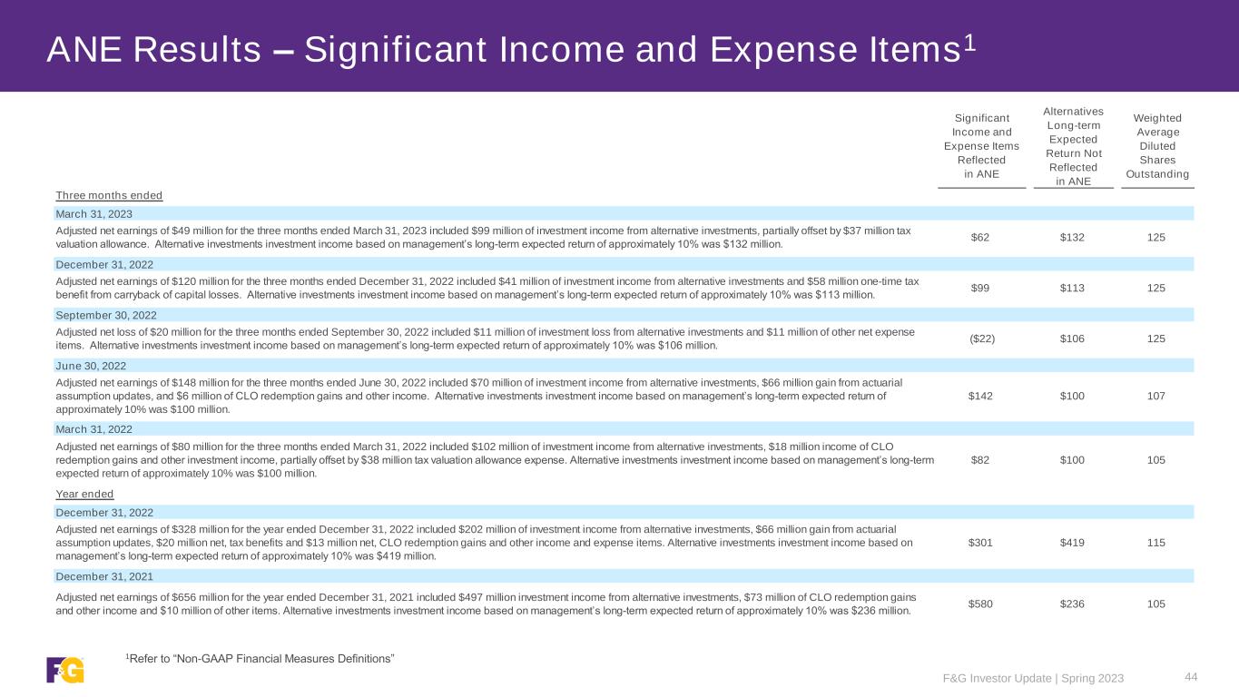 F&G Investor Update | Spring 2023 44 ANE Results – Significant Income and Expense Items1 1Refer to “Non-GAAP Financial Measures Definitions” Significant Income and Expense Items Reflected in ANE Alternatives Long-term Expected Return Not Reflected in ANE Weighted Average Diluted Shares Outstanding Three months ended March 31, 2023 Adjusted net earnings of $49 million for the three months ended March 31, 2023 included $99 million of investment income from alternative investments, partially offset by $37 million tax valuation allowance. Alternative investments investment income based on management’s long-term expected return of approximately 10% was $132 million. $62 $132 125 December 31, 2022 Adjusted net earnings of $120 million for the three months ended December 31, 2022 included $41 million of investment income from alternative investments and $58 million one-time tax benefit from carryback of capital losses. Alternative investments investment income based on management’s long-term expected return of approximately 10% was $113 million. $99 $113 125 September 30, 2022 Adjusted net loss of $20 million for the three months ended September 30, 2022 included $11 million of investment loss from alternative investments and $11 million of other net expense items. Alternative investments investment income based on management’s long-term expected return of approximately 10% was $106 million. ($22) $106 125 June 30, 2022 Adjusted net earnings of $148 million for the three months ended June 30, 2022 included $70 million of investment income from alternative investments, $66 million gain from actuarial assumption updates, and $6 million of CLO redemption gains and other income. Alternative investments investment income based on management’s long-term expected return of approximately 10% was $100 million. $142 $100 107 March 31, 2022 Adjusted net earnings of $80 million for the three months ended March 31, 2022 included $102 million of investment income from alternative investments, $18 million income of CLO redemption gains and other investment income, partially offset by $38 million tax valuation allowance expense. Alternative investments investment income based on management’s long-term expected return of approximately 10% was $100 million. $82 $100 105 Year ended December 31, 2022 Adjusted net earnings of $328 million for the year ended December 31, 2022 included $202 million of investment income from alternative investments, $66 million gain from actuarial assumption updates, $20 million net, tax benefits and $13 million net, CLO redemption gains and other income and expense items. Alternative investments investment income based on management’s long-term expected return of approximately 10% was $419 million. $301 $419 115 December 31, 2021 Adjusted net earnings of $656 million for the year ended December 31, 2021 included $497 million investment income from alternative investments, $73 million of CLO redemption gains and other income and $10 million of other items. Alternative investments investment income based on management’s long-term expected return of approximately 10% was $236 million. $580 $236 105