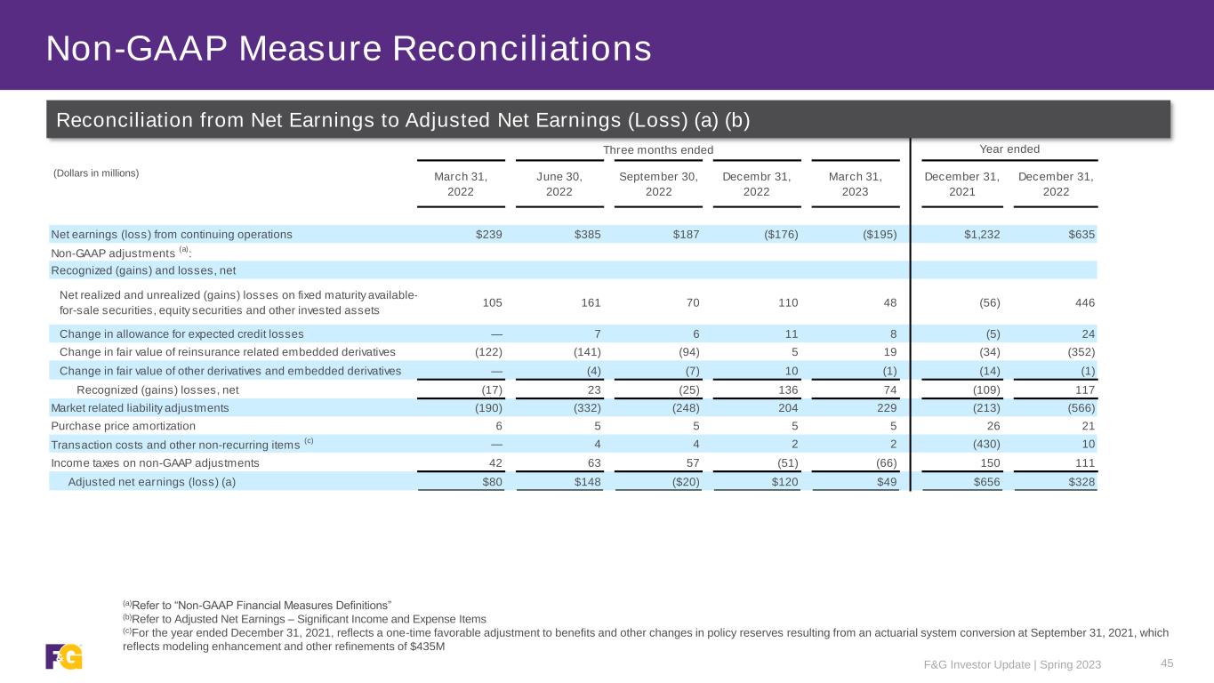 Three months ended March 31, 2022 June 30, 2022 September 30, 2022 Decembr 31, 2022 March 31, 2023 December 31, 2021 December 31, 2022 Net earnings (loss) from continuing operations $239 $385 $187 ($176) ($195) $1,232 $635 Non-GAAP adjustments (a) : Recognized (gains) and losses, net Net realized and unrealized (gains) losses on fixed maturity available- for-sale securities, equity securities and other invested assets 105 161 70 110 48 (56) 446 Change in allowance for expected credit losses — 7 6 11 8 (5) 24 Change in fair value of reinsurance related embedded derivatives (122) (141) (94) 5 19 (34) (352) Change in fair value of other derivatives and embedded derivatives — (4) (7) 10 (1) (14) (1) Recognized (gains) losses, net (17) 23 (25) 136 74 (109) 117 Market related liability adjustments (190) (332) (248) 204 229 (213) (566) Purchase price amortization 6 5 5 5 5 26 21 Transaction costs and other non-recurring items (c) — 4 4 2 2 (430) 10 Income taxes on non-GAAP adjustments 42 63 57 (51) (66) 150 111 Adjusted net earnings (loss) (a) $80 $148 ($20) $120 $49 $656 $328 Year ended F&G Investor Update | Spring 2023 45 Non-GAAP Measure Reconciliations (a)Refer to “Non-GAAP Financial Measures Definitions” (b)Refer to Adjusted Net Earnings – Significant Income and Expense Items (c)For the year ended December 31, 2021, reflects a one-time favorable adjustment to benefits and other changes in policy reserves resulting from an actuarial system conversion at September 31, 2021, which reflects modeling enhancement and other refinements of $435M (Dollars in millions) Reconciliation from Net Earnings to Adjusted Net Earnings (Loss) (a) (b)