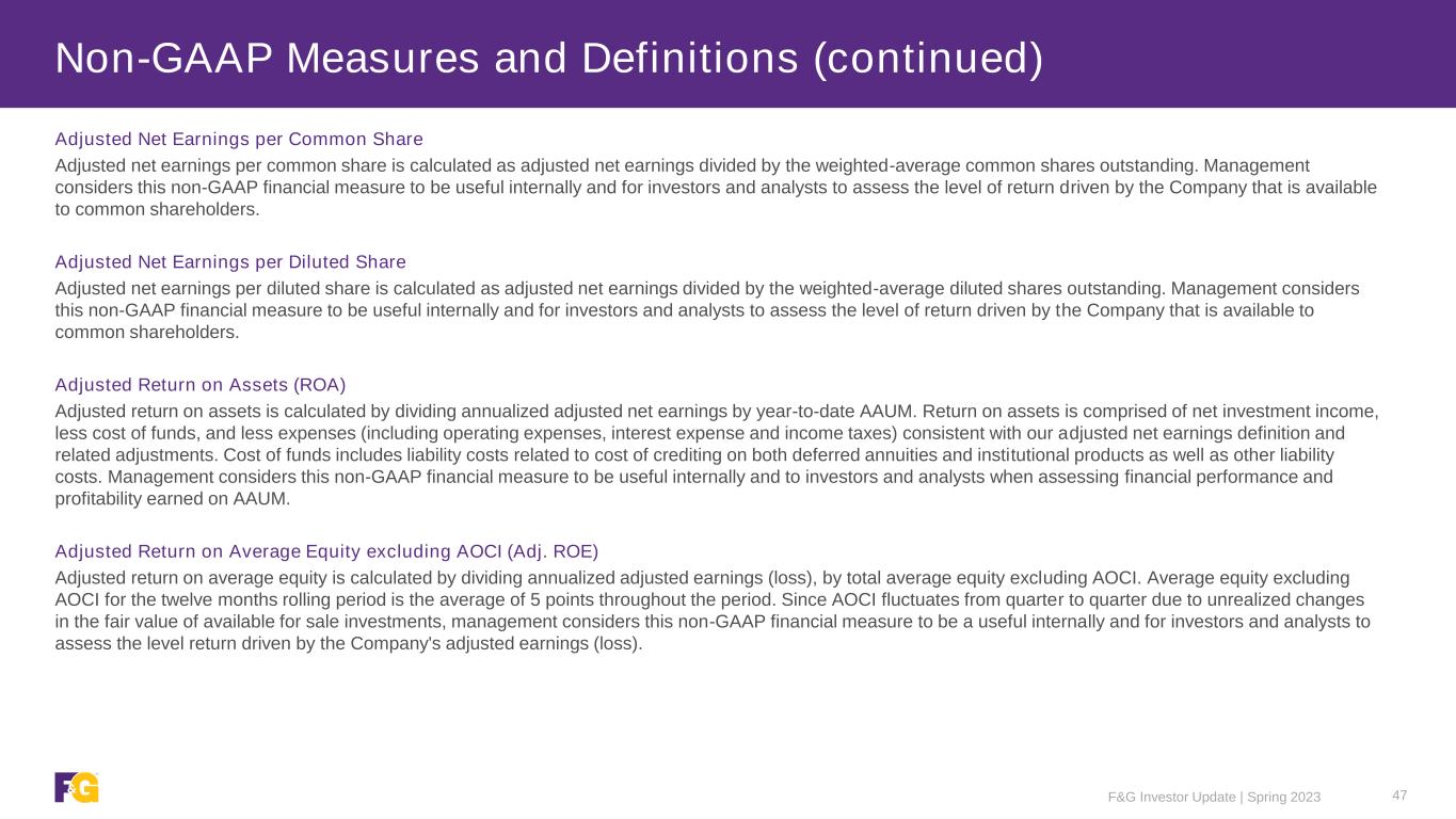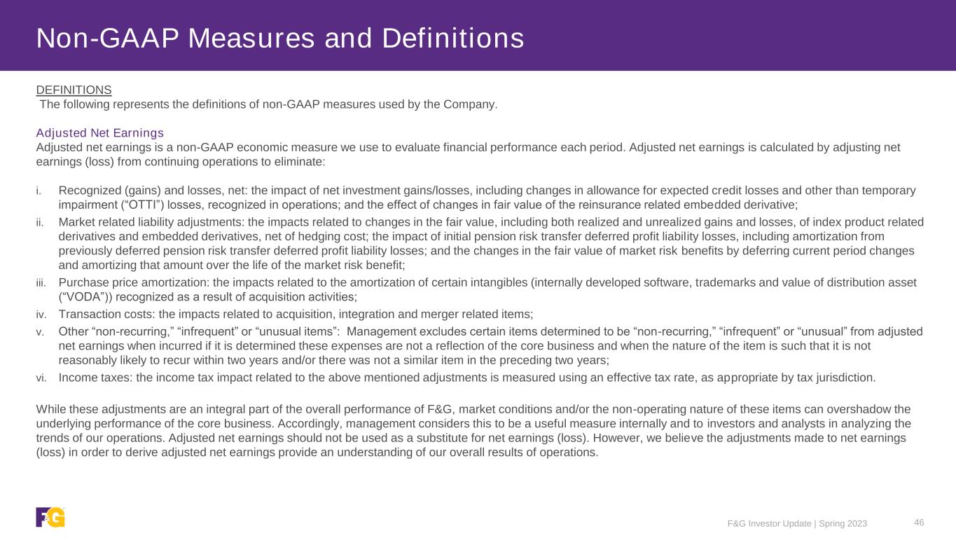 F&G Investor Update | Spring 2023 46 Non-GAAP Measures and Definitions DEFINITIONS The following represents the definitions of non-GAAP measures used by the Company. Adjusted Net Earnings Adjusted net earnings is a non-GAAP economic measure we use to evaluate financial performance each period. Adjusted net earnings is calculated by adjusting net earnings (loss) from continuing operations to eliminate: i. Recognized (gains) and losses, net: the impact of net investment gains/losses, including changes in allowance for expected credit losses and other than temporary impairment (“OTTI”) losses, recognized in operations; and the effect of changes in fair value of the reinsurance related embedded derivative; ii. Market related liability adjustments: the impacts related to changes in the fair value, including both realized and unrealized gains and losses, of index product related derivatives and embedded derivatives, net of hedging cost; the impact of initial pension risk transfer deferred profit liability losses, including amortization from previously deferred pension risk transfer deferred profit liability losses; and the changes in the fair value of market risk benefits by deferring current period changes and amortizing that amount over the life of the market risk benefit; iii. Purchase price amortization: the impacts related to the amortization of certain intangibles (internally developed software, trademarks and value of distribution asset (“VODA”)) recognized as a result of acquisition activities; iv. Transaction costs: the impacts related to acquisition, integration and merger related items; v. Other “non-recurring,” “infrequent” or “unusual items”: Management excludes certain items determined to be “non-recurring,” “infrequent” or “unusual” from adjusted net earnings when incurred if it is determined these expenses are not a reflection of the core business and when the nature of the item is such that it is not reasonably likely to recur within two years and/or there was not a similar item in the preceding two years; vi. Income taxes: the income tax impact related to the above mentioned adjustments is measured using an effective tax rate, as appropriate by tax jurisdiction. While these adjustments are an integral part of the overall performance of F&G, market conditions and/or the non-operating nature of these items can overshadow the underlying performance of the core business. Accordingly, management considers this to be a useful measure internally and to investors and analysts in analyzing the trends of our operations. Adjusted net earnings should not be used as a substitute for net earnings (loss). However, we believe the adjustments made to net earnings (loss) in order to derive adjusted net earnings provide an understanding of our overall results of operations.