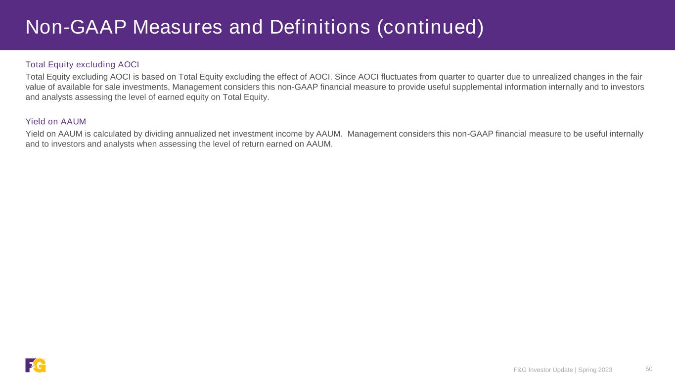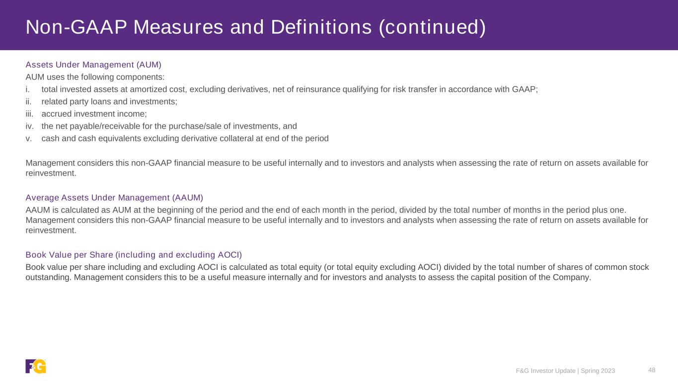 F&G Investor Update | Spring 2023 48 Non-GAAP Measures and Definitions (continued) Assets Under Management (AUM) AUM uses the following components: i. total invested assets at amortized cost, excluding derivatives, net of reinsurance qualifying for risk transfer in accordance with GAAP; ii. related party loans and investments; iii. accrued investment income; iv. the net payable/receivable for the purchase/sale of investments, and v. cash and cash equivalents excluding derivative collateral at end of the period Management considers this non-GAAP financial measure to be useful internally and to investors and analysts when assessing the rate of return on assets available for reinvestment. Average Assets Under Management (AAUM) AAUM is calculated as AUM at the beginning of the period and the end of each month in the period, divided by the total number of months in the period plus one. Management considers this non-GAAP financial measure to be useful internally and to investors and analysts when assessing the rate of return on assets available for reinvestment. Book Value per Share (including and excluding AOCI) Book value per share including and excluding AOCI is calculated as total equity (or total equity excluding AOCI) divided by the total number of shares of common stock outstanding. Management considers this to be a useful measure internally and for investors and analysts to assess the capital position of the Company.