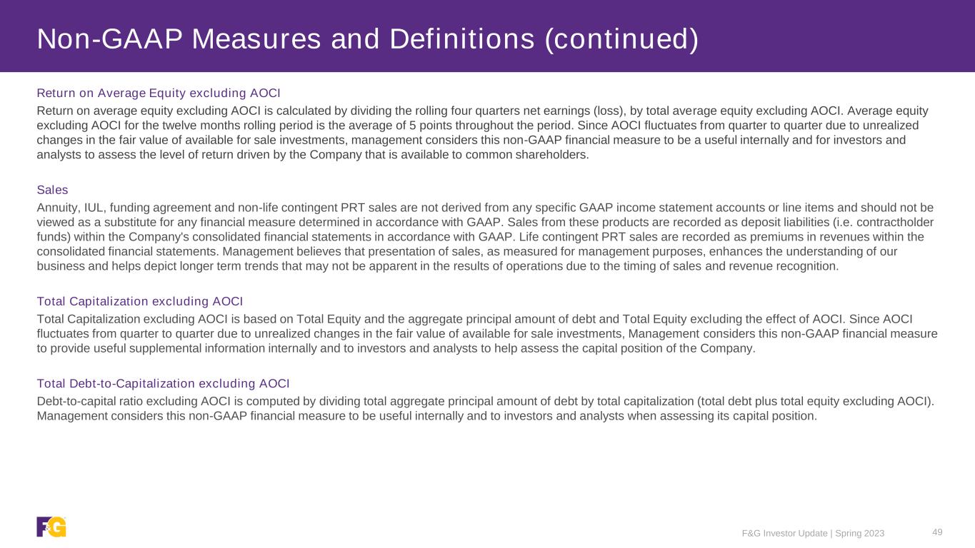 F&G Investor Update | Spring 2023 49 Non-GAAP Measures and Definitions (continued) Return on Average Equity excluding AOCI Return on average equity excluding AOCI is calculated by dividing the rolling four quarters net earnings (loss), by total average equity excluding AOCI. Average equity excluding AOCI for the twelve months rolling period is the average of 5 points throughout the period. Since AOCI fluctuates from quarter to quarter due to unrealized changes in the fair value of available for sale investments, management considers this non-GAAP financial measure to be a useful internally and for investors and analysts to assess the level of return driven by the Company that is available to common shareholders. Sales Annuity, IUL, funding agreement and non-life contingent PRT sales are not derived from any specific GAAP income statement accounts or line items and should not be viewed as a substitute for any financial measure determined in accordance with GAAP. Sales from these products are recorded as deposit liabilities (i.e. contractholder funds) within the Company's consolidated financial statements in accordance with GAAP. Life contingent PRT sales are recorded as premiums in revenues within the consolidated financial statements. Management believes that presentation of sales, as measured for management purposes, enhances the understanding of our business and helps depict longer term trends that may not be apparent in the results of operations due to the timing of sales and revenue recognition. Total Capitalization excluding AOCI Total Capitalization excluding AOCI is based on Total Equity and the aggregate principal amount of debt and Total Equity excluding the effect of AOCI. Since AOCI fluctuates from quarter to quarter due to unrealized changes in the fair value of available for sale investments, Management considers this non-GAAP financial measure to provide useful supplemental information internally and to investors and analysts to help assess the capital position of the Company. Total Debt-to-Capitalization excluding AOCI Debt-to-capital ratio excluding AOCI is computed by dividing total aggregate principal amount of debt by total capitalization (total debt plus total equity excluding AOCI). Management considers this non-GAAP financial measure to be useful internally and to investors and analysts when assessing its capital position.