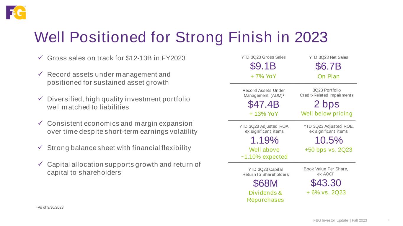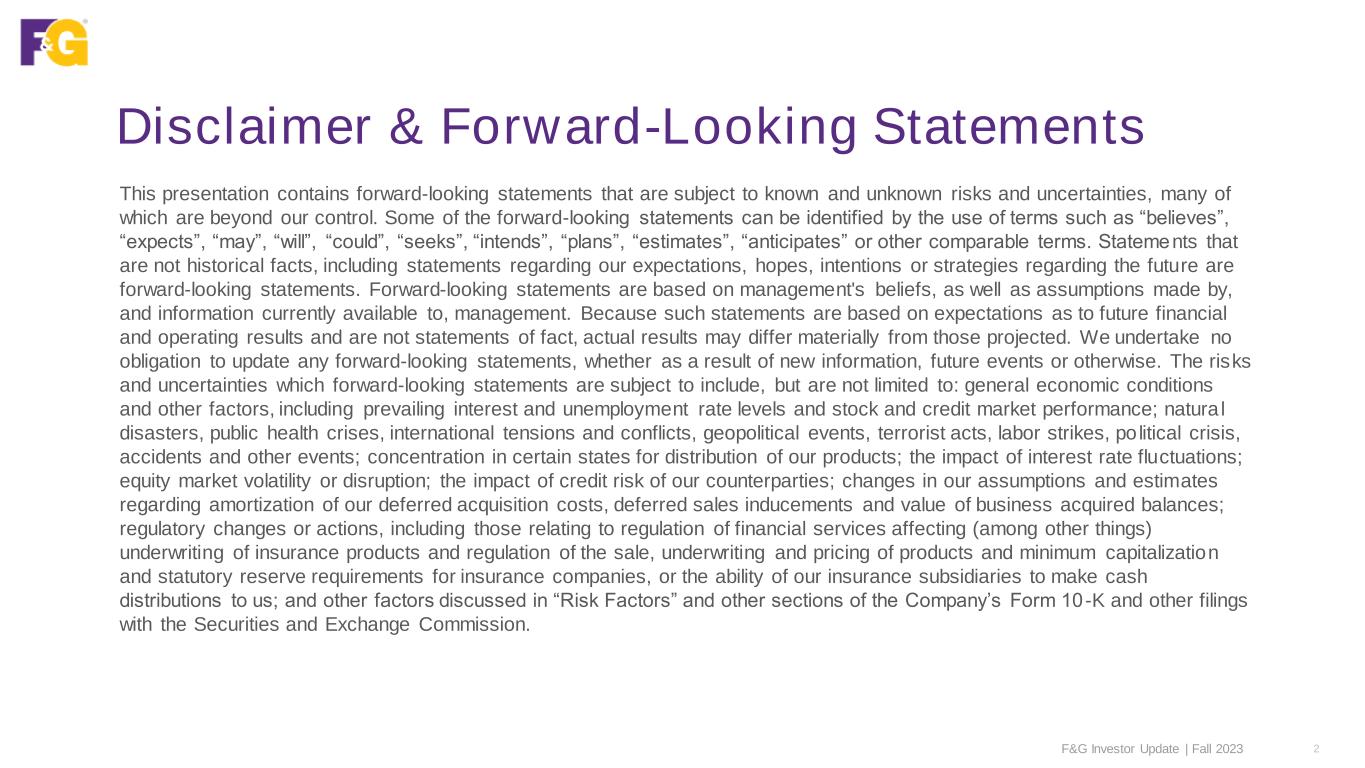 Disclaimer & Forward-Looking Statements This presentation contains forward-looking statements that are subject to known and unknown risks and uncertainties, many of which are beyond our control. Some of the forward-looking statements can be identified by the use of terms such as “believes”, “expects”, “may”, “will”, “could”, “seeks”, “intends”, “plans”, “estimates”, “anticipates” or other comparable terms. Statements that are not historical facts, including statements regarding our expectations, hopes, intentions or strategies regarding the future are forward-looking statements. Forward-looking statements are based on management's beliefs, as well as assumptions made by, and information currently available to, management. Because such statements are based on expectations as to future financial and operating results and are not statements of fact, actual results may differ materially from those projected. We undertake no obligation to update any forward-looking statements, whether as a result of new information, future events or otherwise. The risks and uncertainties which forward-looking statements are subject to include, but are not limited to: general economic conditions and other factors, including prevailing interest and unemployment rate levels and stock and credit market performance; natura l disasters, public health crises, international tensions and conflicts, geopolitical events, terrorist acts, labor strikes, po litical crisis, accidents and other events; concentration in certain states for distribution of our products; the impact of interest rate fluctuations; equity market volatility or disruption; the impact of credit risk of our counterparties; changes in our assumptions and estimates regarding amortization of our deferred acquisition costs, deferred sales inducements and value of business acquired balances; regulatory changes or actions, including those relating to regulation of financial services affecting (among other things) underwriting of insurance products and regulation of the sale, underwriting and pricing of products and minimum capitalization and statutory reserve requirements for insurance companies, or the ability of our insurance subsidiaries to make cash distributions to us; and other factors discussed in “Risk Factors” and other sections of the Company’s Form 10 -K and other filings with the Securities and Exchange Commission. F&G Investor Update | Fall 2023 2