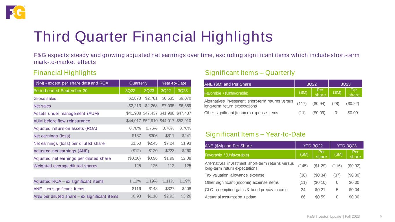 Well Positioned for Strong Finish in 2023 ✓ Gross sales on track for $12-13B in FY2023 ✓ Record assets under management and positioned for sustained asset growth ✓ Diversified, high quality investment portfolio well matched to liabilities ✓ Consistent economics and margin expansion over time despite short-term earnings volatility ✓ Strong balance sheet with financial flexibility ✓ Capital allocation supports growth and return of capital to shareholders F&G Investor Update | Fall 2023 4 YTD 3Q23 Gross Sales $9.1B + 7% YoY YTD 3Q23 Net Sales $6.7B On Plan Record Assets Under Management (AUM)1 $47.4B + 13% YoY 3Q23 Portfolio Credit-Related Impairments 2 bps Well below pricing YTD 3Q23 Adjusted ROA, ex significant items 1.19% Well above ~1.10% expected YTD 3Q23 Capital Return to Shareholders $68M Dividends & Repurchases Book Value Per Share, ex AOCI1 $43.30 + 6% vs. 2Q23 1As of 9/30/2023 YTD 3Q23 Adjusted ROE, ex significant items 10.5% +50 bps vs. 2Q23