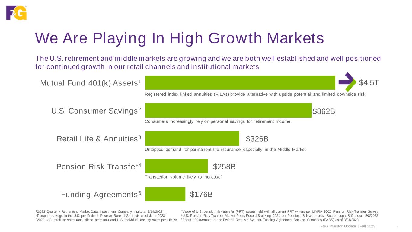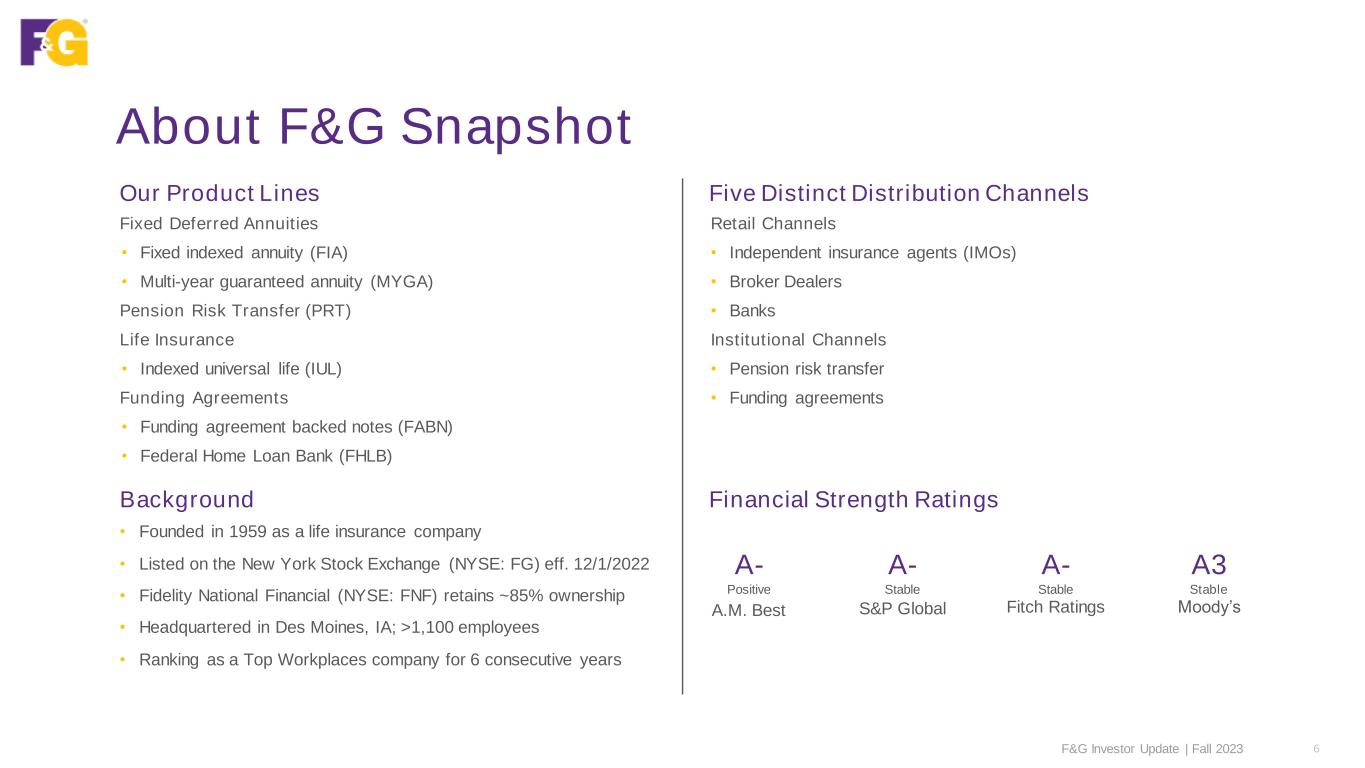 We Are Playing In High Growth Markets Mutual Fund 401(k) Assets1 U.S. Consumer Savings2 Retail Life & Annuities3 Pension Risk Transfer4 Funding Agreements6 $4.5T $862B $326B $258B $176B The U.S. retirement and middle markets are growing and we are both well established and well positioned for continued growth in our retail channels and institutional markets 12Q23 Quarterly Retirement Market Data, Investment Company Institute, 9/14/2023 2Personal savings in the U.S. per Federal Reserve Bank of St. Louis as of June 2023 32022 U.S. retail life sales (annualized premium) and U.S. individual annuity sales per LIMRA 4Value of U.S. pension risk transfer (PRT) assets held with all current PRT writers per LIMRA 2Q23 Pension Risk Transfer Survey 5U.S. Pension Risk Transfer Market Posts Record-Breaking 2021 per Pensions & Investments, Source Legal & General, 2/8/2022 6Board of Governors of the Federal Reserve System, Funding Agreement-Backed Securities (FABS) as of 3/31/2023 Registered index linked annuities (RILAs) provide alternative with upside potential and limited downside risk Consumers increasingly rely on personal savings for retirement income Untapped demand for permanent life insurance, especially in the Middle Market Transaction volume likely to increase5 F&G Investor Update | Fall 2023 9