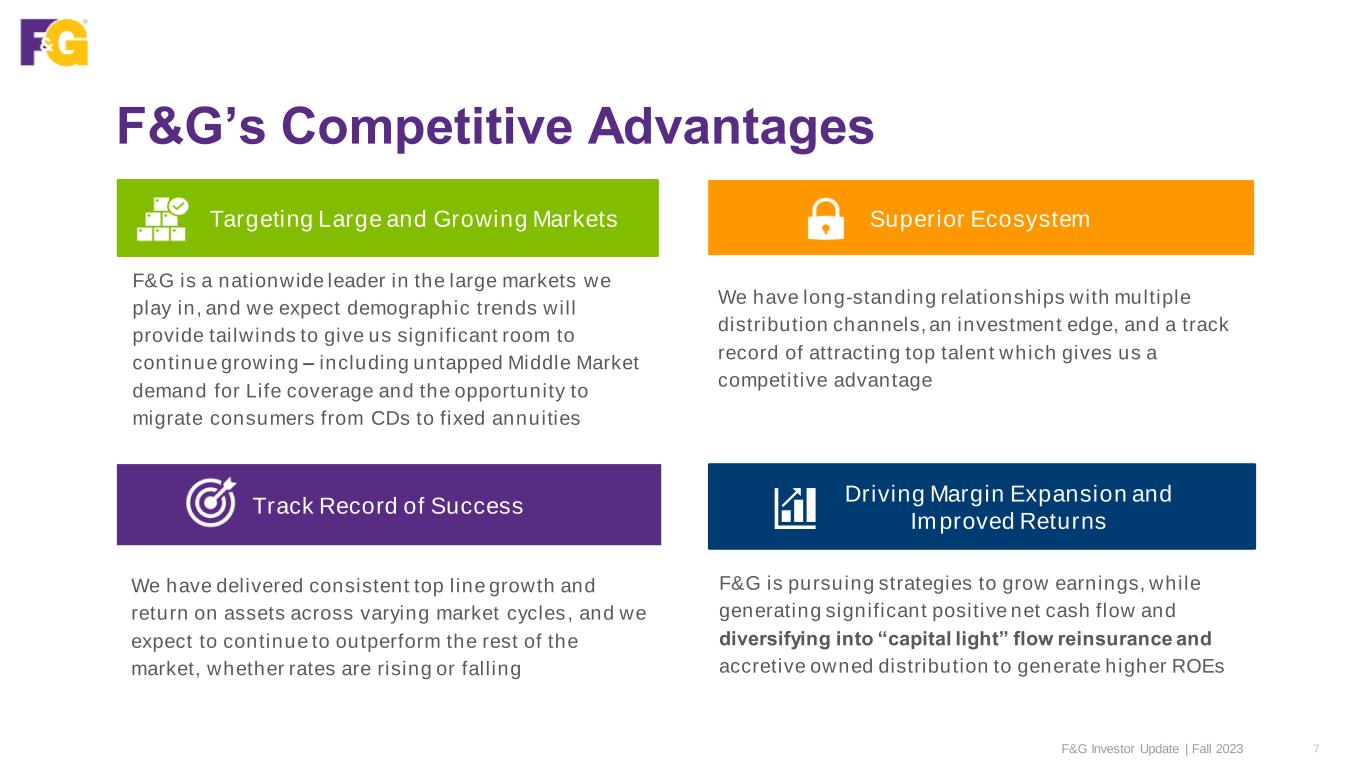 About F&G Snapshot Our Product Lines Fixed Deferred Annuities • Fixed indexed annuity (FIA) • Multi-year guaranteed annuity (MYGA) Pension Risk Transfer (PRT) Life Insurance • Indexed universal life (IUL) Funding Agreements • Funding agreement backed notes (FABN) • Federal Home Loan Bank (FHLB) Background Five Distinct Distribution Channels Retail Channels • Independent insurance agents (IMOs) • Broker Dealers • Banks Institutional Channels • Pension risk transfer • Funding agreements Financial Strength Ratings A- Positive A.M. Best A- Stable S&P Global A- Stable Fitch Ratings A3 Stable Moody’s F&G Investor Update | Fall 2023 6 • Founded in 1959 as a life insurance company • Listed on the New York Stock Exchange (NYSE: FG) eff. 12/1/2022 • Fidelity National Financial (NYSE: FNF) retains ~85% ownership • Headquartered in Des Moines, IA; >1,100 employees • Ranking as a Top Workplaces company for 6 consecutive years