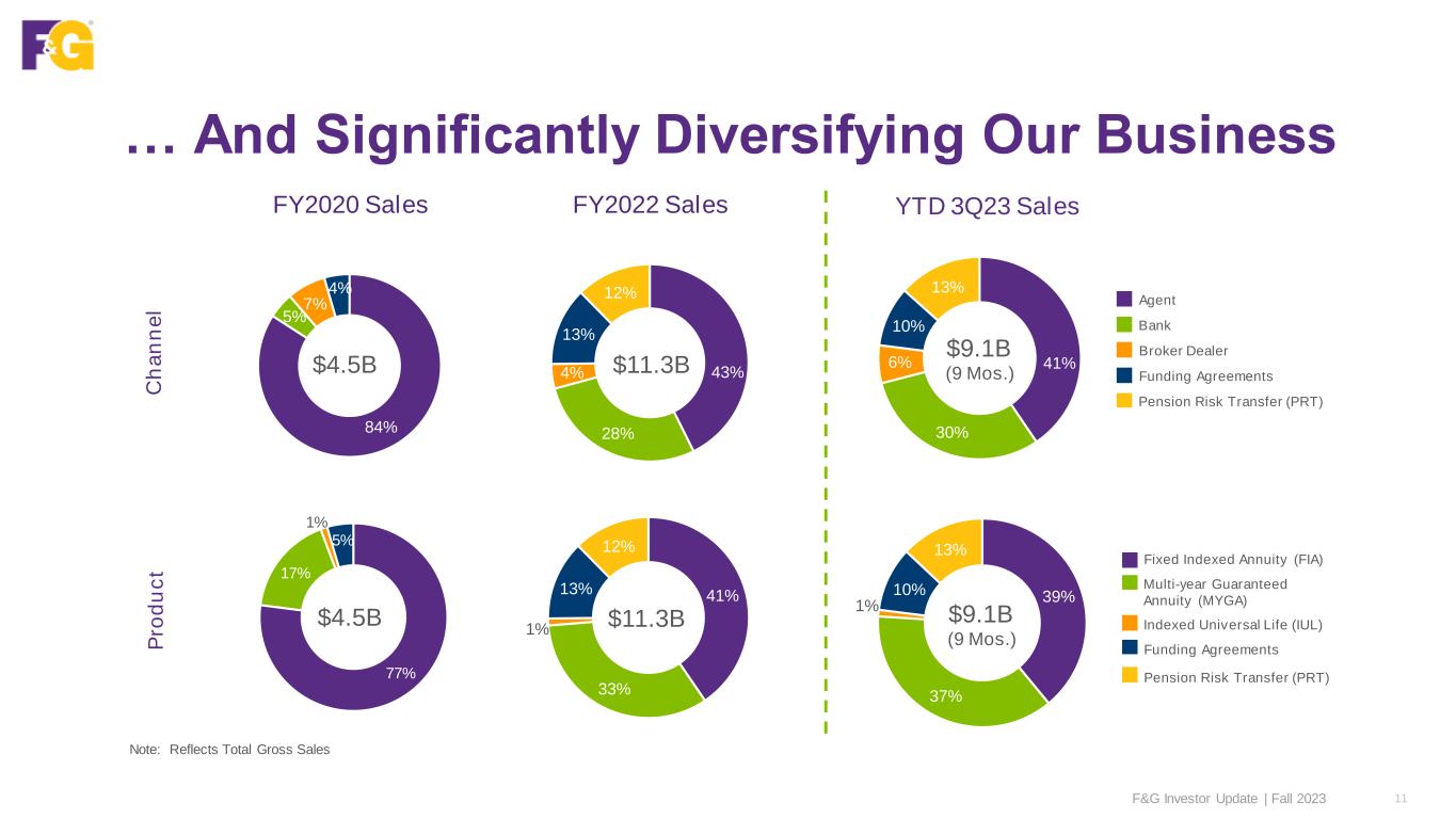 … And We’re Winning … Annual Gross Sales by Retail Channel and Institutional Market ($B) 1CAGR reflects 2018-2023E annual periods 2018 2019 2020 2021 2022 2023E Funding Agreements Agent PRT Broker Dealer Bank $9.6B $4.5B $3.9B $3.4B • FNF and F&G Merger • F&G ratings upgrades (June 2020) $11.3B ~30% CAGR1 10 $12-13B F&G Investor Update | Fall 2023
