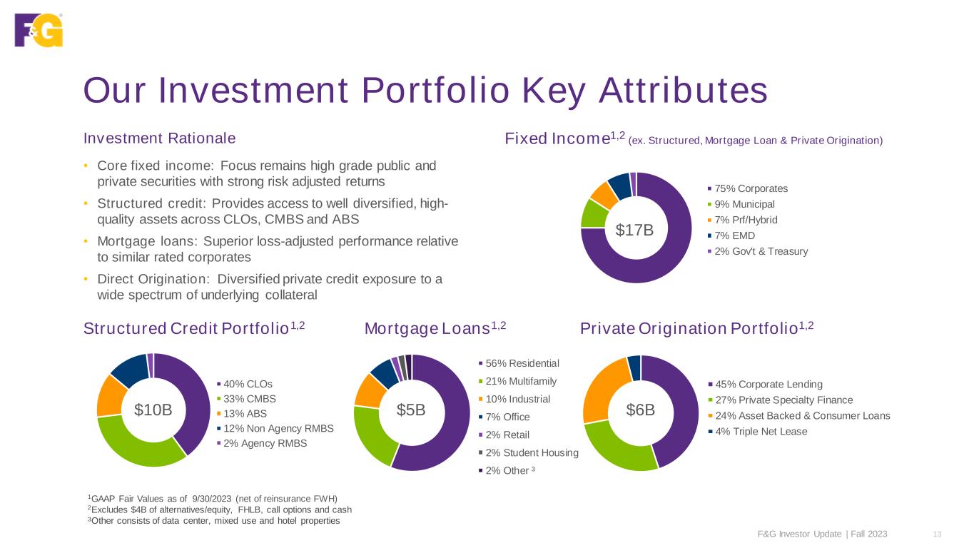 High Quality & Well-Diversified Portfolio1 Investment Portfolio by Asset Class Investment Portfolio by NAIC Designation F&G Investor Update | Fall 2023 12 Portfolio conservativelypositioned& well-matched to liability profile • Fixed income is 96% investment grade • Modest average credit-related impairments of 5 bps over the last 3 years, well below our pricing assumption and remained below that level in 3Q23 CMBS/CML portfolios are high quality, with moderate leverage and diversified across property types • CMBS, CMLs and Alternative LPs comprise 19% of total portfolio, with only 2.3% in office • Alternative LPs comprise 6% of total portfolio, with only 2.1% of Alternative LPs portfolio in office 29% Corpoates 24% Structured Securities 15% Private Origination 11% Mortgage Loans 6% Alternatives (LP) 4% Municipal 3% Prf/Hybrid 3% EMD 2% Other ² 2% Cash 1% Gov't & Treasury $42B 59% NAIC 1 26% NAIC 2 3% NAIC 3 1% NAIC 4/5/6 6% LP 3% Other ² 2% Cash $42B 1GAAP Fair Values as of 09/30/2023 (net of reinsurance FWH) 2Other consists of ICOLI, FHLB stock, LIHTC, options and private origination equity tranches