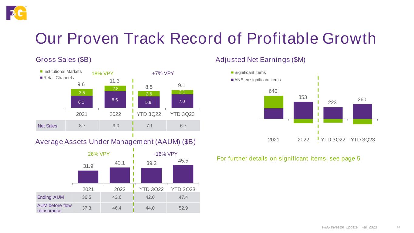 Structured Credit Portfolio1,2 56% Residential 21% Multifamily 10% Industrial 7% Office 2% Retail 2% Student Housing 2% Other ³ Our Investment Portfolio Key Attributes Investment Rationale • Core fixed income: Focus remains high grade public and private securities with strong risk adjusted returns • Structured credit: Provides access to well diversified, high- quality assets across CLOs, CMBS and ABS • Mortgage loans: Superior loss-adjusted performance relative to similar rated corporates • Direct Origination: Diversified private credit exposure to a wide spectrum of underlying collateral Fixed Income1,2 (ex. Structured, Mortgage Loan & Private Origination) Private Origination Portfolio1,2 1GAAP Fair Values as of 9/30/2023 (net of reinsurance FWH) 2Excludes $4B of alternatives/equity, FHLB, call options and cash 3Other consists of data center, mixed use and hotel properties 75% Corporates 9% Municipal 7% Prf/Hybrid 7% EMD 2% Gov't & Treasury $17B 40% CLOs 33% CMBS 13% ABS 12% Non Agency RMBS 2% Agency RMBS $10B Mortgage Loans1,2 $5B 45% Corporate Lending 27% Private Specialty Finance 24% Asset Backed & Consumer Loans 4% Triple Net Lease $6B F&G Investor Update | Fall 2023 13