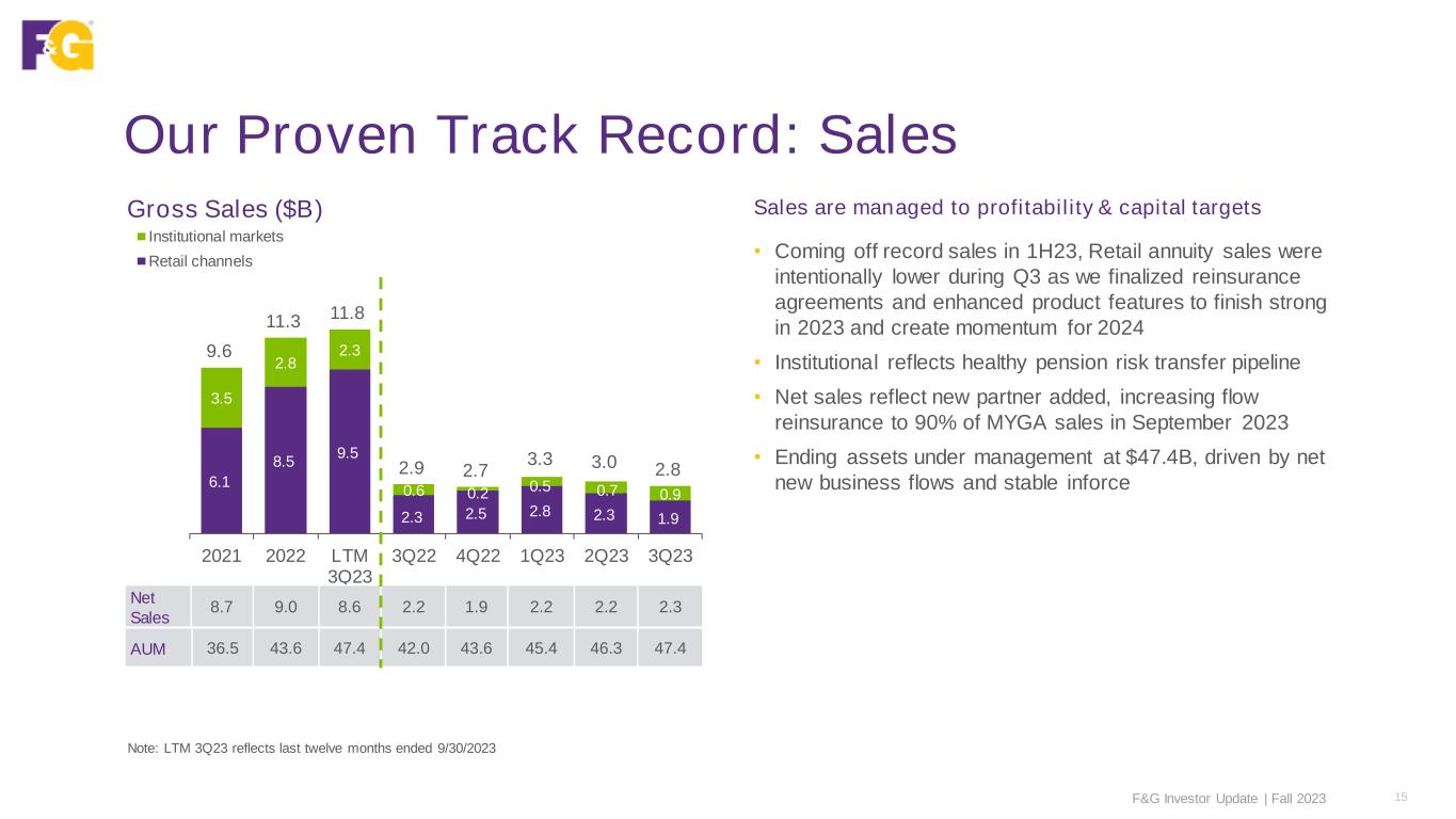 Our Proven Track Record of Profitable Growth Gross Sales ($B) Average Assets Under Management (AAUM) ($B) Adjusted Net Earnings ($M) 6.1 8.5 5.9 7.0 3.5 2.8 2.6 2.1 9.6 11.3 8.5 9.1 2021 2022 YTD 3Q22 YTD 3Q23 Institutional Markets Retail Channels Net Sales 8.7 9.0 7.1 6.7 +7% VPY18% VPY 31.9 40.1 39.2 45.5 2021 2022 YTD 3Q22 YTD 3Q23 +16% VPY26% VPY Ending AUM 36.5 43.6 42.0 47.4 AUM before flow reinsurance 37.3 46.4 44.0 52.9 640 353 223 260 2021 2022 YTD 3Q22 YTD 3Q23 Significant items ANE ex significant items F&G Investor Update | Fall 2023 14 For further details on significant items, see page 5