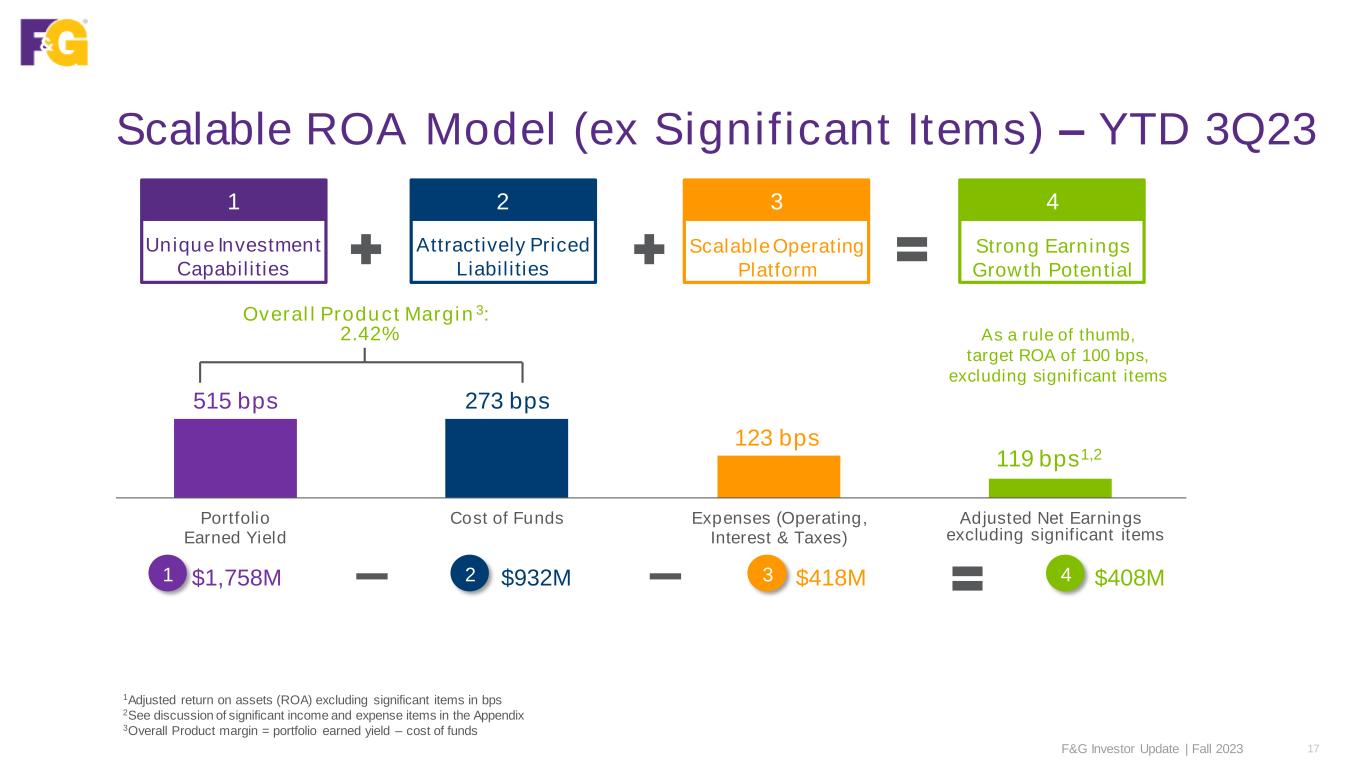 Our Proven Track Record: Adj. Net Earnings 16F&G Investor Update | Fall 2023 F&G expects steady and growing adjusted net earnings over time, excluding significant items • Growth in ANE ex significant items reflects: • asset growth, • margin expansion from core business & flow reinsurance, • disciplined expense management over time, and • higher interest expense on debt (vs. prior year) • For further details on significant items, see page 5 Adjusted Net Earnings (ANE) ($M) 640 353 390 (12) 130 61 79 120 2021 2022 LTM 3Q23 3Q22 4Q22 1Q23 2Q23 3Q23 Significant items ANE ex significant items Net earnings (loss) 1,240 635 65 187 (176) (195) 130 306 ANE per share $6.10 $3.07 $3.12 ($0.10) $1.04 $0.49 $0.63 $0.96 Adj. ROA1 0.93% 1.18% 1.23% 1.11% 1.18% 1.18% 1.16% 1.19% Adj. ROE1 8% 10% 10% 9% 10% 10% 10% 11% Note: LTM 3Q23 reflects last twelve months ended 9/30/2023 1Reflects adjusted net earnings ex significant items