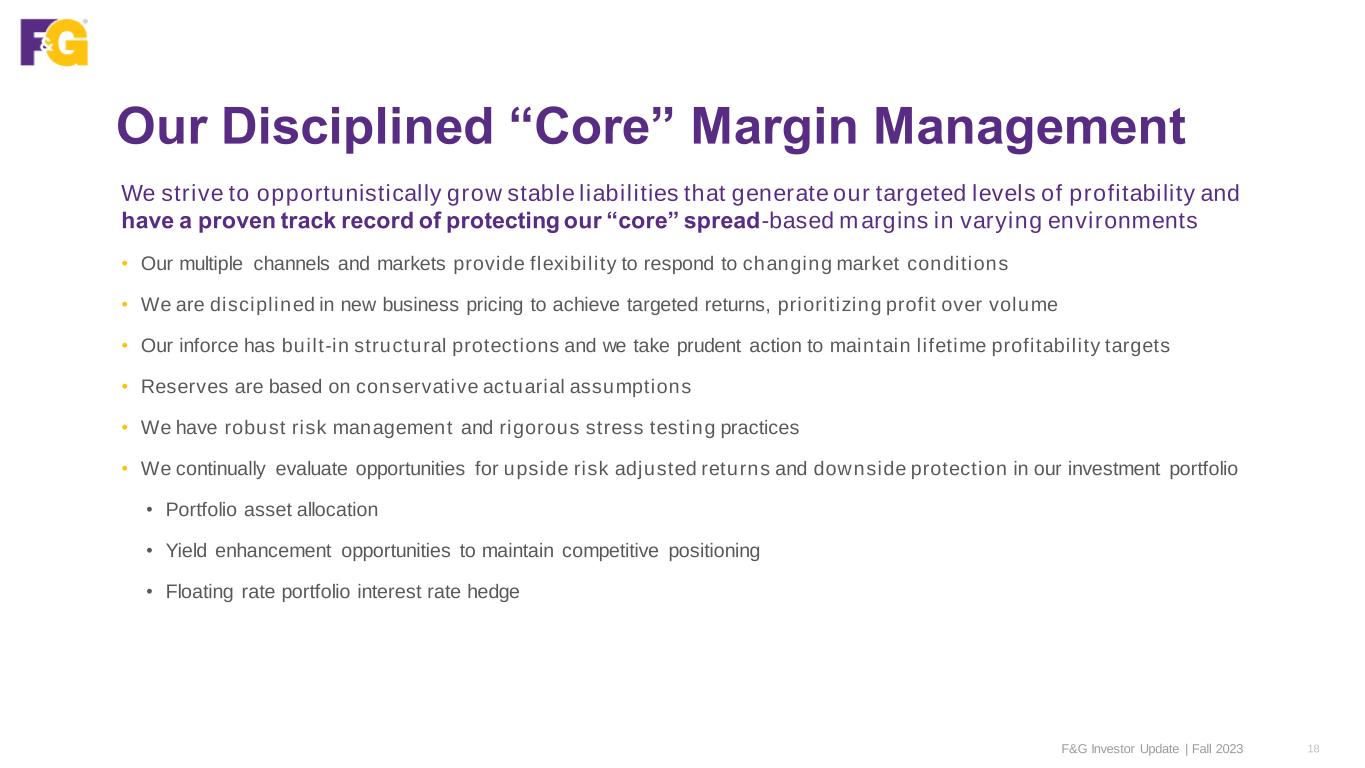 Scalable ROA Model (ex Significant Items) – YTD 3Q23 515 bps 273 bps 123 bps 119 bps1,2 Portfolio Earned Yield Cost of Funds Expenses (Operating, Interest & Taxes) Adjusted Net Earnings excluding significant items Unique Investment Capabilities Attractively Priced Liabilities Scalable Operating Platform Strong Earnings Growth Potential Overall Product Margin3: 2.42% 4 $408M 1 2 3 4 As a rule of thumb, target ROA of 100 bps, excluding significant items 1 2 3$1,758M $932M $418M F&G Investor Update | Fall 2023 17 1Adjusted return on assets (ROA) excluding significant items in bps 2See discussion of significant income and expense items in the Appendix 3Overall Product margin = portfolio earned yield – cost of funds