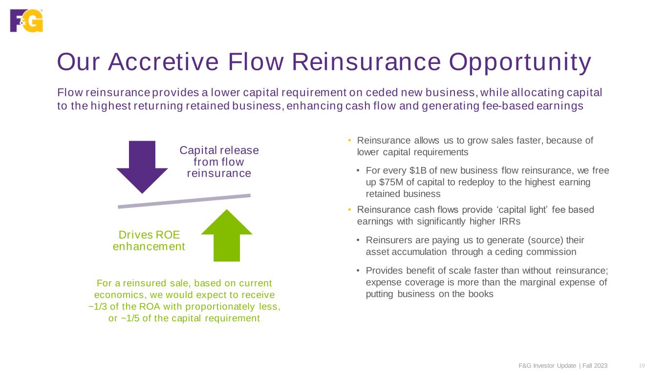 Our Disciplined “Core” Margin Management We strive to opportunistically grow stable liabilities that generate our targeted levels of profitability and have a proven track record of protecting our “core” spread-based margins in varying environments • Our multiple channels and markets provide flexibility to respond to changing market conditions • We are disciplined in new business pricing to achieve targeted returns, prioritizing profit over volume • Our inforce has built-in structural protections and we take prudent action to maintain lifetime profitability targets • Reserves are based on conservative actuarial assumptions • We have robust risk management and rigorous stress testing practices • We continually evaluate opportunities for upside risk adjusted returns and downside protection in our investment portfolio • Portfolio asset allocation • Yield enhancement opportunities to maintain competitive positioning • Floating rate portfolio interest rate hedge F&G Investor Update | Fall 2023 18