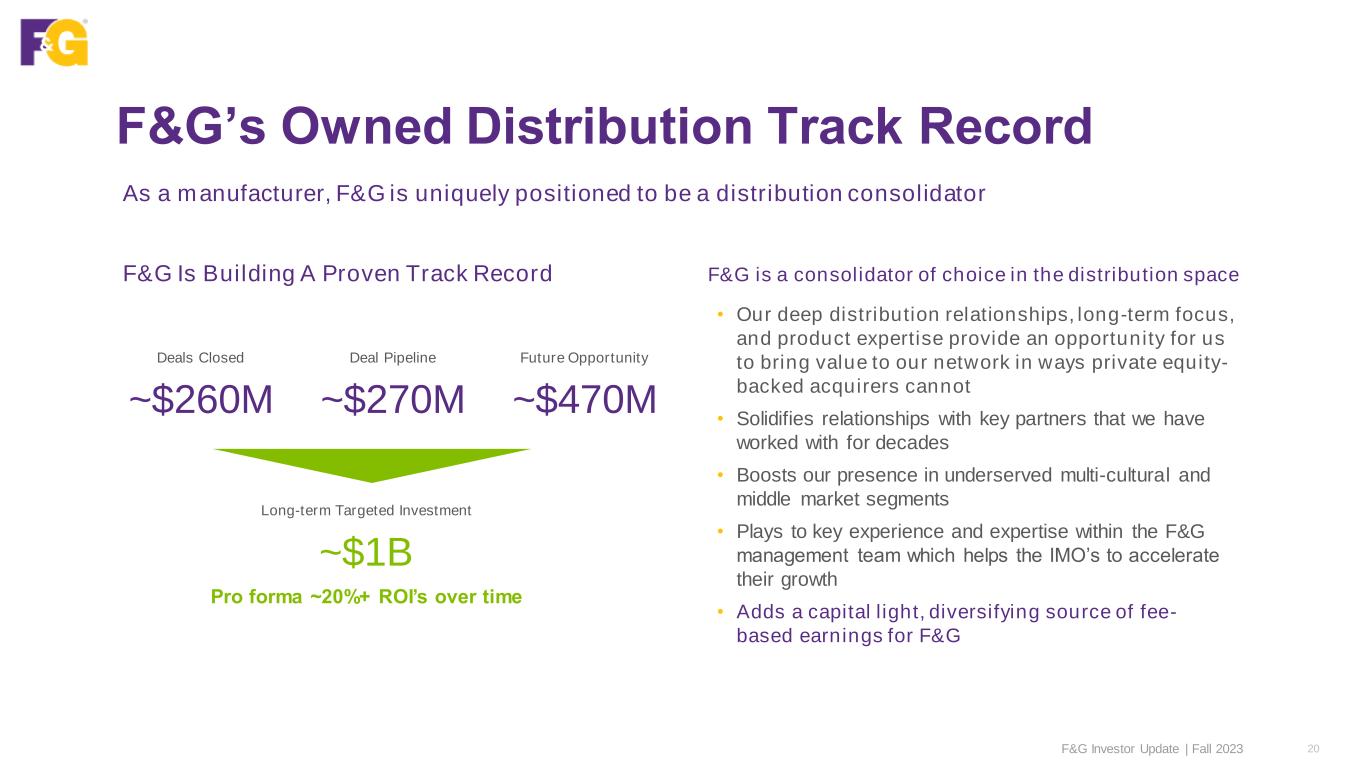 Our Accretive Flow Reinsurance Opportunity Flow reinsurance provides a lower capital requirement on ceded new business, while allocating capital to the highest returning retained business, enhancing cash flow and generating fee-based earnings Capital release from flow reinsurance Drives ROE enhancement For a reinsured sale, based on current economics, we would expect to receive ~1/3 of the ROA with proportionately less, or ~1/5 of the capital requirement F&G Investor Update | Fall 2023 19 • Reinsurance allows us to grow sales faster, because of lower capital requirements • For every $1B of new business flow reinsurance, we free up $75M of capital to redeploy to the highest earning retained business • Reinsurance cash flows provide ‘capital light’ fee based earnings with significantly higher IRRs • Reinsurers are paying us to generate (source) their asset accumulation through a ceding commission • Provides benefit of scale faster than without reinsurance; expense coverage is more than the marginal expense of putting business on the books