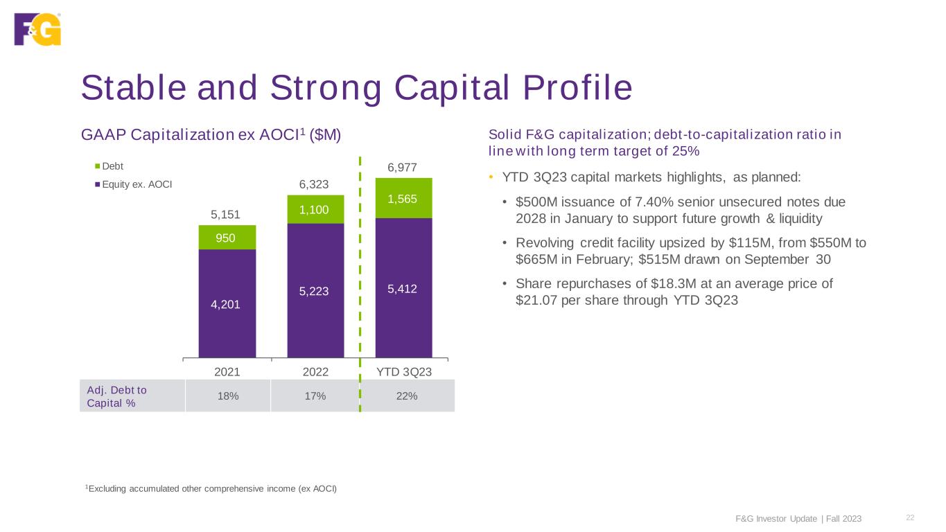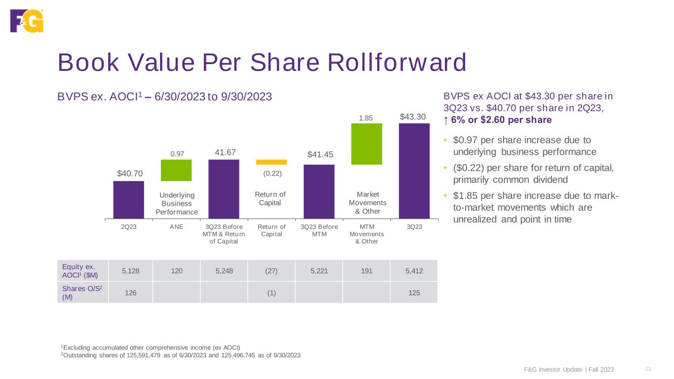 Book Value Per Share Rollforward 21F&G Investor Update | Fall 2023 BVPS ex. AOCI1 – 6/30/2023 to 9/30/2023 $40.70 41.67 $41.45 $43.30 0.97 (0.22) 1.85 $39.00 $39.50 $40.00 $40.50 $41.00 $41.50 $42.00 $42.50 $43.00 $43.50 2Q23 ANE 3Q23 Before MTM & Return of Capital Return of Capital 3Q23 Before MTM MTM Movements & Other 3Q23 Equity ex. AOCI1 ($M) 5,128 120 5,248 (27) 5,221 191 5,412 Shares O/S2 (M) 126 (1) 125 1Excluding accumulated other comprehensive income (ex AOCI) 2Outstanding shares of 125,591,479 as of 6/30/2023 and 125,496,745 as of 9/30/2023 Underlying Business Performance Market Movements & Other Return of Capital BVPS ex AOCI at $43.30 per share in 3Q23 vs. $40.70 per share in 2Q23, ↑ 6% or $2.60 per share • $0.97 per share increase due to underlying business performance • ($0.22) per share for return of capital, primarily common dividend • $1.85 per share increase due to mark- to-market movements which are unrealized and point in time