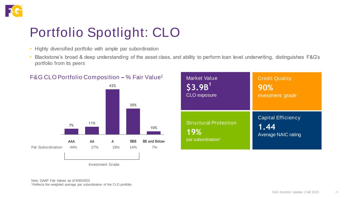 Structured Credit – Why We Like It Investment Rationale • Collateralized loan obligation (CLO) portfolio well diversified across industry, issuer and manager; focus on investment grade with ample par subordination • Commercial mortgage-backed securities (CMBS) focus on seasoned CMBS which allows for visibility into credit performance, built-in appreciation and contractual amortization which reduces risk exposure; target more stable property types, such as multi-family, to create a defensive portfolio • Asset Backed Securities (ABS) focus on high quality, directly originated specialty finance assets diversified by collateral type CLO Top 10 Industries2 CMBS by Property Type1 ABS Top 10 Collateral Type1 1GAAP Fair Values as of 9/30/2023 (net of reinsurance FWH) 2Par values as of 9/30/2023 (net of reinsurance FWH) 12% Royalty & Licensing 11% NAV Lending 9% Residential Solar 9% Home Improvement 8% Broadly Diversified 6% Telecommunications 6% Aviation 5% Manufactured Housing 5% Student Loan 4% Structured Settlements 25% All Other (< Top 10) $5B F&G Investor Update | Fall 2023 25 38% Multifamily 18% Office 10% Hotel 8% Retail 7% Industrial 7% Defeased 10% Other 1% Self-Storage 1% Life Science $3B 13% High Tech 12% Healthcare & Pharmaceuticals 9% Banking, Finance, Insurance & Real Estate 7% Services: Business 5% Media: Broadcasting & Subscription 5% Hotels, Gaming & Leisure 4% Telecommunications 4% Construction & Building 4% Capital Equipment 4% Chemicals, Plastics & Rubber 33% Other $4B