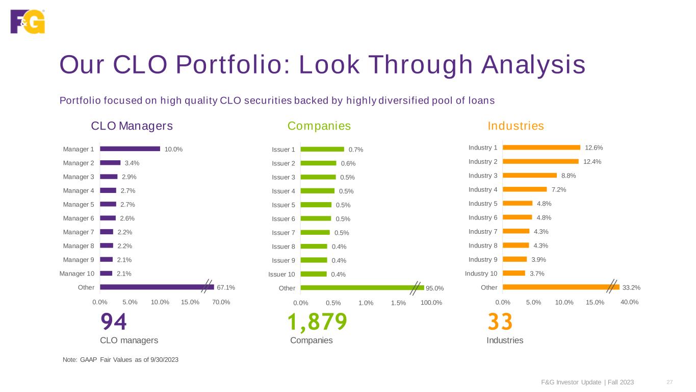 33.2% 3.7% 3.9% 4.3% 4.3% 4.8% 4.8% 7.2% 8.8% 12.4% 12.6% 0.0% 5.0% 10.0% 15.0% 20.0% Other Industry 10 Industry 9 Industry 8 Industry 7 Industry 6 Industry 5 Industry 4 Industry 3 Industry 2 Industry 1 Our CLO Portfolio: Look Through Analysis Portfolio focused on high quality CLO securities backed by highly diversified pool of loans Note: GAAP Fair Values as of 9/30/2023 IndustriesCompaniesCLO Managers 94 CLO managers 1,879 Companies 33 Industries F&G Investor Update | Fall 2023 27 67.1% 2.1% 2.1% 2.2% 2.2% 2.6% 2.7% 2.7% 2.9% 3.4% 10.0% 0.0% 5.0% 10.0% 15.0% 20.0% Other Manager 10 Manager 9 Manager 8 Manager 7 Manager 6 Manager 5 Manager 4 Manager 3 Manager 2 Manager 1 7 . 95.0% 0.4% 0.4% 0.4% 0.5% 0.5% 0.5% 0.5% 0.5% 0.6% 0.7% 0.0% 0.5% 1.0% 1.5% 2.0% Other Issuer 10 Issuer 9 Issuer 8 Issuer 7 Issuer 6 Issuer 5 Issuer 4 Issuer 3 Issuer 2 Issuer 1 100.0100.0% 40.0%