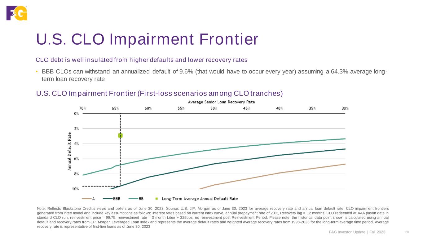 U.S. CLO Impairment Frontier CLO debt is well insulated from higher defaults and lower recovery rates • BBB CLOs can withstand an annualized default of 9.6% (that would have to occur every year) assuming a 64.3% average long- term loan recovery rate U.S. CLO Impairment Frontier (First-loss scenarios among CLO tranches) Note: Reflects Blackstone Credit’s views and beliefs as of June 30, 2023. Source: U.S. J.P. Morgan as of June 30, 2023 for average recovery rate and annual loan default rate; CLO impairment frontiers generated from Intex model and include key assumptions as follows: Interest rates based on current Intex curve, annual prepayment rate of 20%, Recovery lag = 12 months, CLO redeemed at AAA payoff date in standard CLO run, reinvestment price = 99.75, reinvestment rate = 3 month Libor + 325bps, no reinvestment post Reinvestment Period. Please note: the historical data point shown is calculated using annual default and recovery rates from J.P. Morgan Leveraged Loan Index and represents the average default rates and weighted average recovery rates from 1998-2023 for the long-term average time period. Average recovery rate is representative of first-lien loans as of June 30, 2023 F&G Investor Update | Fall 2023 28