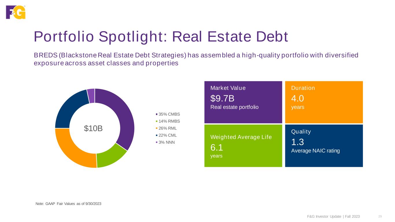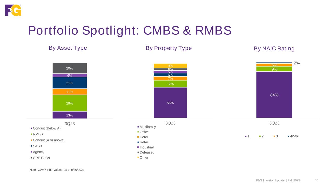 35% CMBS 14% RMBS 26% RML 22% CML 3% NNN Duration 4.0 years Quality 1.3 Average NAIC rating Market Value $9.7B Real estate portfolio Weighted Average Life 6.1 years Portfolio Spotlight: Real Estate Debt BREDS (Blackstone Real Estate Debt Strategies) has assembled a high-quality portfolio with diversified exposure across asset classes and properties Note: GAAP Fair Values as of 9/30/2023 $10B F&G Investor Update | Fall 2023 29