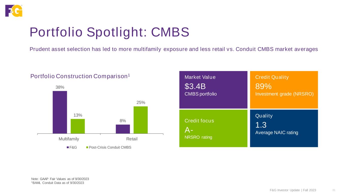 Portfolio Spotlight: CMBS & RMBS By Asset Type By Property Type By NAIC Rating F&G Investor Update | Fall 2023 30 Note: GAAP Fair Values as of 9/30/2023 56% 12% 7% 6% 5% 5% 9% 3Q23 Multifamily Office Hotel Retail Industrial Defeased Other 13% 29% 11% 21% 6% 20% 3Q23 Conduit (Below A) RMBS Conduit (A or above) SASB Agency CRE CLOs 84% 9% 5% 2% 3Q23 1 2 3 4/5/6