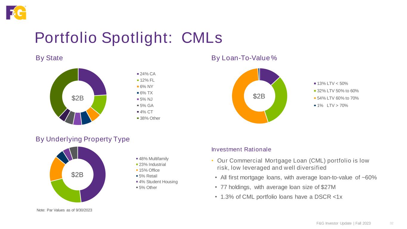 Portfolio Spotlight: CMLs By State By Underlying Property Type By Loan-To-Value % Investment Rationale • Our Commercial Mortgage Loan (CML) portfolio is low risk, low leveraged and well diversified • All first mortgage loans, with average loan-to-value of ~60% • 77 holdings, with average loan size of $27M • 1.3% of CML portfolio loans have a DSCR <1x Note: Par Values as of 9/30/2023 24% CA 12% FL 6% NY 6% TX 5% NJ 5% GA 4% CT 38% Other $2B 13% LTV < 50% 32% LTV 50% to 60% 54% LTV 60% to 70% 1% LTV > 70% $2B 48% Multifamily 23% Industrial 15% Office 5% Retail 4% Student Housing 5% Other $2B F&G Investor Update | Fall 2023 32