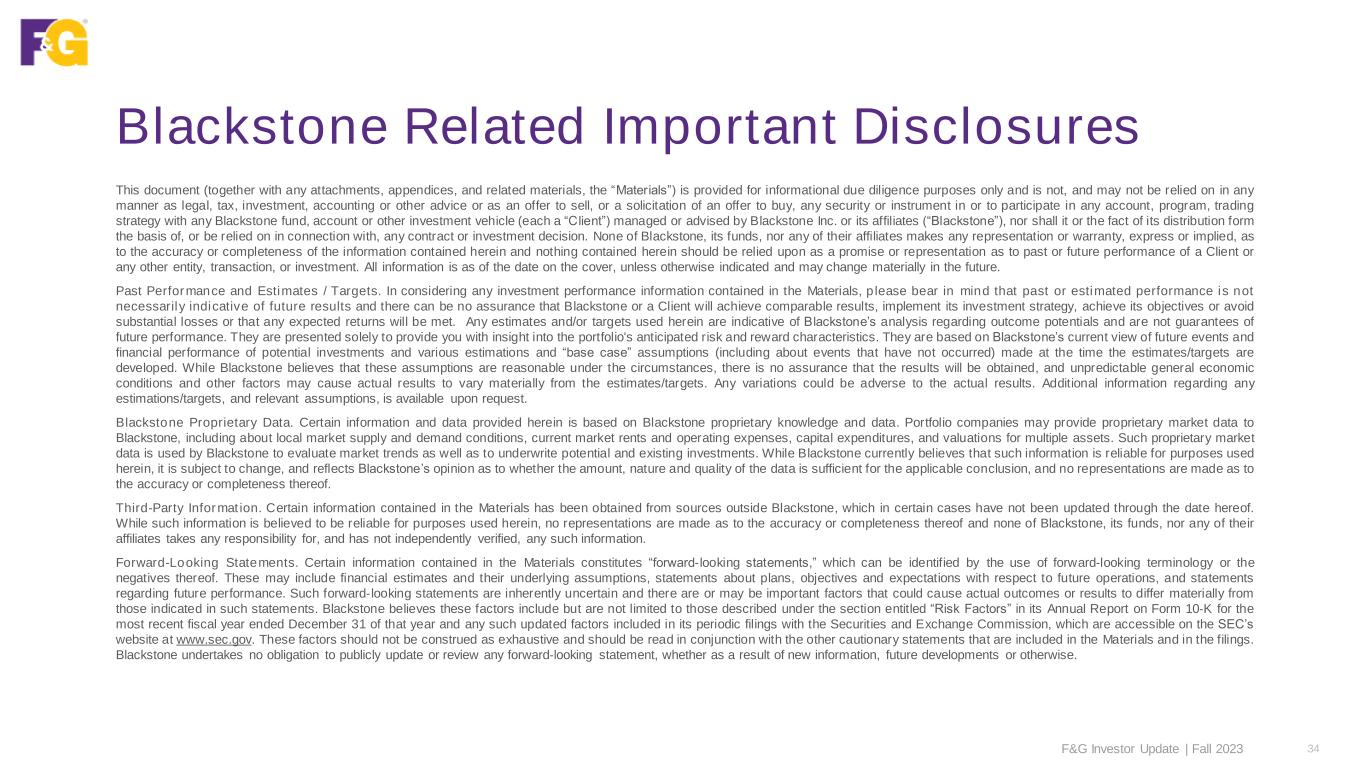 Blackstone Related Important Disclosures This document (together with any attachments, appendices, and related materials, the “Materials”) is provided for informational due diligence purposes only and is not, and may not be relied on in any manner as legal, tax, investment, accounting or other advice or as an offer to sell, or a solicitation of an offer to buy, any security or instrument in or to participate in any account, program, trading strategy with any Blackstone fund, account or other investment vehicle (each a “Client”) managed or advised by Blackstone Inc. or its affiliates (“Blackstone”), nor shall it or the fact of its distribution form the basis of, or be relied on in connection with, any contract or investment decision. None of Blackstone, its funds, nor any of their affiliates makes any representation or warranty, express or implied, as to the accuracy or completeness of the information contained herein and nothing contained herein should be relied upon as a promise or representation as to past or future performance of a Client or any other entity, transaction, or investment. All information is as of the date on the cover, unless otherwise indicated and may change materially in the future. Past Performance and Estimates / Targets. In considering any investment performance information contained in the Materials, please bear in mind that past or estimated performance is not necessarily indicative of future results and there can be no assurance that Blackstone or a Client will achieve comparable results, implement its investment strategy, achieve its objectives or avoid substantial losses or that any expected returns will be met. Any estimates and/or targets used herein are indicative of Blackstone’s analysis regarding outcome potentials and are not guarantees of future performance. They are presented solely to provide you with insight into the portfolio's anticipated risk and reward characteristics. They are based on Blackstone’s current view of future events and financial performance of potential investments and various estimations and “base case” assumptions (including about events that have not occurred) made at the time the estimates/targets are developed. While Blackstone believes that these assumptions are reasonable under the circumstances, there is no assurance that the results will be obtained, and unpredictable general economic conditions and other factors may cause actual results to vary materially from the estimates/targets. Any variations could be adverse to the actual results. Additional information regarding any estimations/targets, and relevant assumptions, is available upon request. Blackstone Proprietary Data. Certain information and data provided herein is based on Blackstone proprietary knowledge and data. Portfolio companies may provide proprietary market data to Blackstone, including about local market supply and demand conditions, current market rents and operating expenses, capital expenditures, and valuations for multiple assets. Such proprietary market data is used by Blackstone to evaluate market trends as well as to underwrite potential and existing investments. While Blackstone currently believes that such information is reliable for purposes used herein, it is subject to change, and reflects Blackstone’s opinion as to whether the amount, nature and quality of the data is sufficient for the applicable conclusion, and no representations are made as to the accuracy or completeness thereof. Third-Party Information. Certain information contained in the Materials has been obtained from sources outside Blackstone, which in certain cases have not been updated through the date hereof. While such information is believed to be reliable for purposes used herein, no representations are made as to the accuracy or completeness thereof and none of Blackstone, its funds, nor any of their affiliates takes any responsibility for, and has not independently verified, any such information. Forward-Looking Statements. Certain information contained in the Materials constitutes “forward-looking statements,” which can be identified by the use of forward-looking terminology or the negatives thereof. These may include financial estimates and their underlying assumptions, statements about plans, objectives and expectations with respect to future operations, and statements regarding future performance. Such forward‐ looking statements are inherently uncertain and there are or may be important factors that could cause actual outcomes or results to differ materially from those indicated in such statements. Blackstone believes these factors include but are not limited to those described under the section entitled “Risk Factors” in its Annual Report on Form 10‐K for the most recent fiscal year ended December 31 of that year and any such updated factors included in its periodic filings with the Securities and Exchange Commission, which are accessible on the SEC’s website at www.sec.gov. These factors should not be construed as exhaustive and should be read in conjunction with the other cautionary statements that are included in the Materials and in the filings. Blackstone undertakes no obligation to publicly update or review any forward‐looking statement, whether as a result of new information, future developments or otherwise. 34F&G Investor Update | Fall 2023