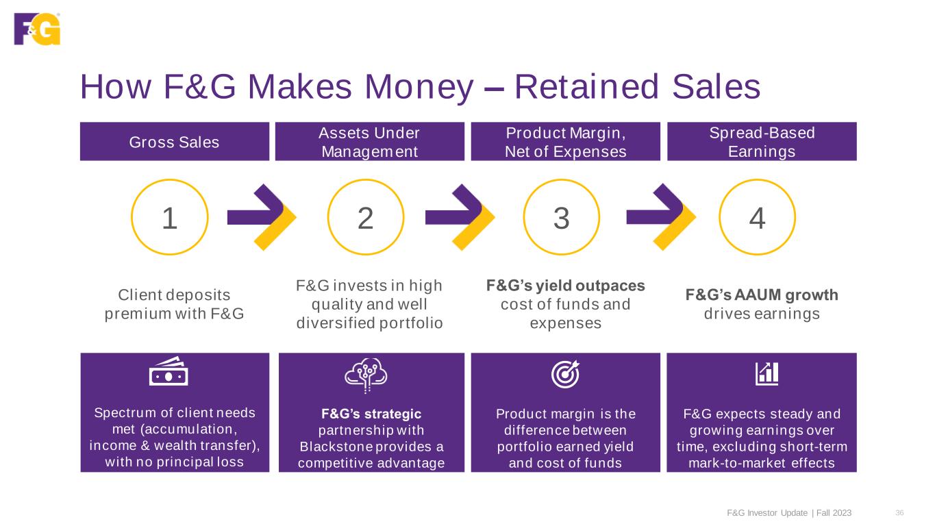 How F&G Makes Money – Retained Sales Client deposits premium with F&G 1 F&G invests in high quality and well diversified portfolio 2 F&G’s yield outpaces cost of funds and expenses 3 F&G’s AAUM growth drives earnings 4 Spectrum of client needs met (accumulation, income & wealth transfer), with no principal loss F&G’s strategic partnership with Blackstone provides a competitive advantage Product margin is the difference between portfolio earned yield and cost of funds F&G expects steady and growing earnings over time, excluding short-term mark-to-market effects Gross Sales Assets Under Management Product Margin, Net of Expenses Spread-Based Earnings F&G Investor Update | Fall 2023 36