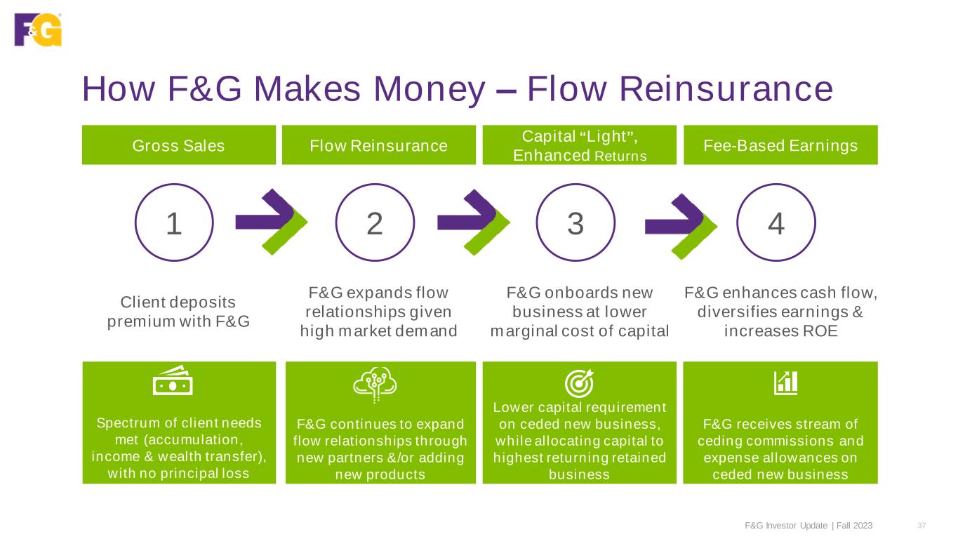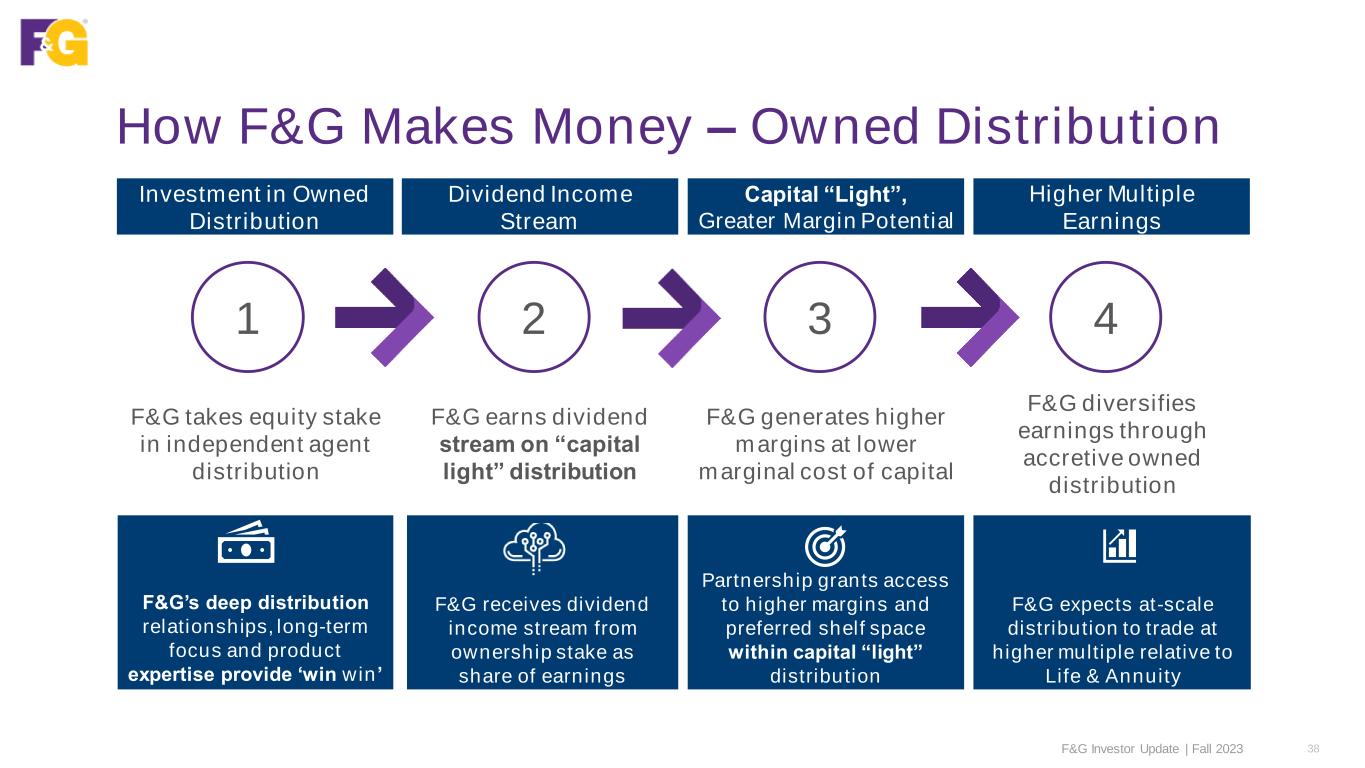 How F&G Makes Money – Flow Reinsurance Client deposits premium with F&G 1 F&G expands flow relationships given high market demand 2 F&G onboards new business at lower marginal cost of capital 3 F&G enhances cash flow, diversifies earnings & increases ROE 4 Spectrum of client needs met (accumulation, income & wealth transfer), with no principal loss F&G continues to expand flow relationships through new partners &/or adding new products Lower capital requirement on ceded new business, while allocating capital to highest returning retained business F&G receives stream of ceding commissions and expense allowances on ceded new business Gross Sales Flow Reinsurance Capital “Light”, Enhanced Returns Fee-Based Earnings F&G Investor Update | Fall 2023 37