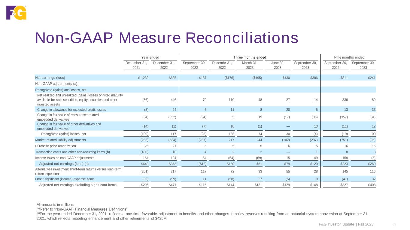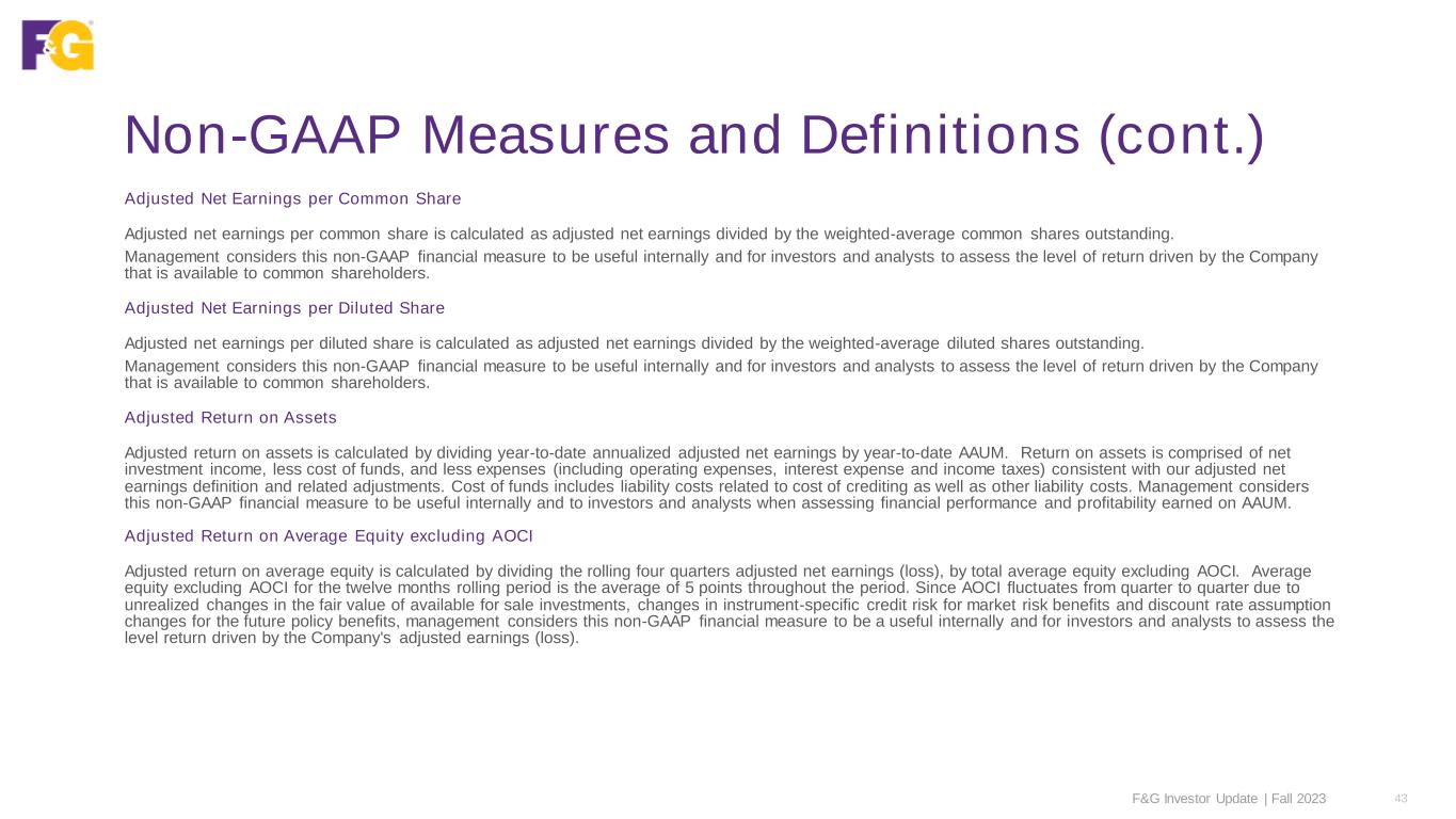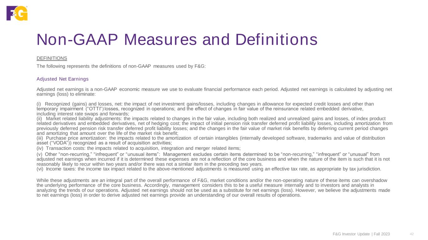 Non-GAAP Measures and Definitions F&G Investor Update | Fall 2023 42 DEFINITIONS The following represents the definitions of non-GAAP measures used by F&G: Adjusted Net Earnings Adjusted net earnings is a non-GAAP economic measure we use to evaluate financial performance each period. Adjusted net earnings is calculated by adjusting net earnings (loss) to eliminate: (i) Recognized (gains) and losses, net: the impact of net investment gains/losses, including changes in allowance for expected credit losses and other than temporary impairment (“OTTI”) losses, recognized in operations; and the effect of changes in fair value of the reinsurance related embedded derivative, including interest rate swaps and forwards; (ii) Market related liability adjustments: the impacts related to changes in the fair value, including both realized and unrealized gains and losses, of index product related derivatives and embedded derivatives, net of hedging cost; the impact of initial pension risk transfer deferred profit liability losses, including amortization from previously deferred pension risk transfer deferred profit liability losses; and the changes in the fair value of market risk benefits by deferring current period changes and amortizing that amount over the life of the market risk benefit; (iii) Purchase price amortization: the impacts related to the amortization of certain intangibles (internally developed software, trademarks and value of distribution asset (“VODA”)) recognized as a result of acquisition activities; (iv) Transaction costs: the impacts related to acquisition, integration and merger related items; (v) Other “non-recurring,” “infrequent” or “unusual items”: Management excludes certain items determined to be “non-recurring,” “infrequent” or “unusual” from adjusted net earnings when incurred if it is determined these expenses are not a reflection of the core business and when the nature of the item is such that it is not reasonably likely to recur within two years and/or there was not a similar item in the preceding two years. (vi) Income taxes: the income tax impact related to the above-mentioned adjustments is measured using an effective tax rate, as appropriate by tax jurisdiction. While these adjustments are an integral part of the overall performance of F&G, market conditions and/or the non-operating nature of these items can overshadow the underlying performance of the core business. Accordingly, management considers this to be a useful measure internally and to investors and analysts in analyzing the trends of our operations. Adjusted net earnings should not be used as a substitute for net earnings (loss). However, we believe the adjustments made to net earnings (loss) in order to derive adjusted net earnings provide an understanding of our overall results of operations.