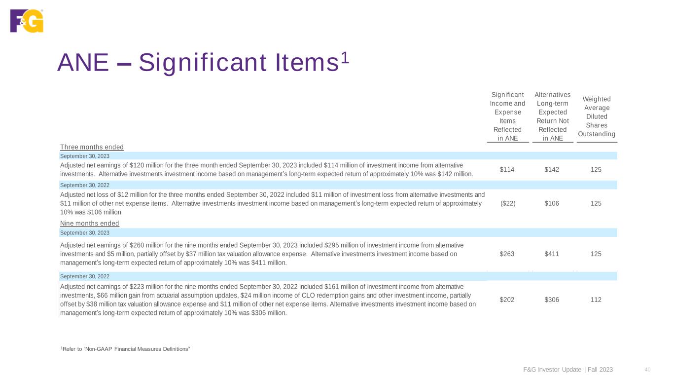 Non-GAAP Measure Reconciliations All amounts in millions (a)Refer to “Non-GAAP Financial Measures Definitions” (b)For the year ended December 31, 2021, reflects a one-time favorable adjustment to benefits and other changes in policy reserves resulting from an actuarial system conversion at September 31, 2021, which reflects modeling enhancement and other refinements of $435M F&G Investor Update | Fall 2023 39 Year ended Three months ended December 31, 2021 December 31, 2022 September 30, 2022 Decembr 31, 2022 March 31, 2023 June 30, 2023 September 30, 2023 September 30, 2022 September 30, 2023 Net earnings (loss) $1,232 $635 $187 ($176) ($195) $130 $306 $811 $241 Non-GAAP adjustments (a): Recognized (gains) and losses, net Net realized and unrealized (gains) losses on fixed maturity available-for-sale securities, equity securities and other invested assets (56) 446 70 110 48 27 14 336 89 Change in allowance for expected credit losses (5) 24 6 11 8 20 5 13 33 Change in fair value of reinsurance related embedded derivatives (34) (352) (94) 5 19 (17) (36) (357) (34) Change in fair value of other derivatives and embedded derivatives (14) (1) (7) 10 (1) — 13 (11) 12 Recognized (gains) losses, net (109) 117 (25) 136 74 30 (4) (19) 100 Market related liability adjustments (233) (534) (237) 217 244 (102) (237) (751) (95) Purchase price amortization 26 21 5 5 5 6 5 16 16 Transaction costs and other non-recurring items (b) (430) 10 4 2 2 — 1 8 3 Income taxes on non-GAAP adjustments 154 104 54 (54) (69) 15 49 158 (5) Adjusted net earnings (loss) (a) $640 $353 ($12) $130 $61 $79 $120 $223 $260 Alternatives investment short-term returns versus long-term return expections (261) 217 117 72 33 55 28 145 116 Other significant (income) expense items (83) (99) 11 (58) 37 (5) 0 (41) 32 Adjusted net earnings excluding significant items $296 $471 $116 $144 $131 $129 $148 $327 $408 Nine months ended