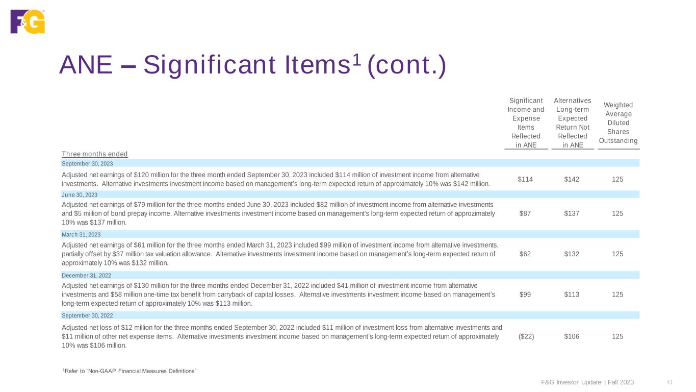 Significant Income and Expense Items Reflected in ANE Alternatives Long-term Expected Return Not Reflected in ANE Weighted Average Diluted Shares Outstanding Three months ended September 30, 2023 Adjusted net earnings of $120 million for the three month ended September 30, 2023 included $114 million of investment income from alternative investments. Alternative investments investment income based on management’s long-term expected return of approximately 10% was $142 million. $114 $142 125 June 30, 2023 Adjusted net earnings of $79 million for the three months ended June 30, 2023 included $82 million of investment income from alternative investments and $5 million of bond prepay income. Alternative investments investment income based on management's long-term expected return of approzimately 10% was $137 million. $87 $137 125 March 31, 2023 Adjusted net earnings of $61 million for the three months ended March 31, 2023 included $99 million of investment income from alternative investments, partially offset by $37 million tax valuation allowance. Alternative investments investment income based on management’s long-term expected return of approximately 10% was $132 million. $62 $132 125 December 31, 2022 Adjusted net earnings of $130 million for the three months ended December 31, 2022 included $41 million of investment income from alternative investments and $58 million one-time tax benefit from carryback of capital losses. Alternative investments investment income based on management’s long-term expected return of approximately 10% was $113 million. $99 $113 125 September 30, 2022 Adjusted net loss of $12 million for the three months ended September 30, 2022 included $11 million of investment loss from alternative investments and $11 million of other net expense items. Alternative investments investment income based on management’s long-term expected return of approximately 10% was $106 million. ($22) $106 125 ANE – Significant Items1 (cont.) 1Refer to “Non-GAAP Financial Measures Definitions” F&G Investor Update | Fall 2023 41