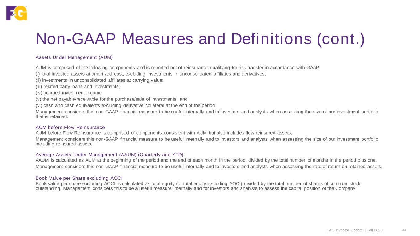 Non-GAAP Measures and Definitions (cont.) F&G Investor Update | Fall 2023 44 Assets Under Management (AUM) AUM is comprised of the following components and is reported net of reinsurance qualifying for risk transfer in accordance with GAAP: (i) total invested assets at amortized cost, excluding investments in unconsolidated affiliates and derivatives; (ii) investments in unconsolidated affiliates at carrying value; (iii) related party loans and investments; (iv) accrued investment income; (v) the net payable/receivable for the purchase/sale of investments; and (vi) cash and cash equivalents excluding derivative collateral at the end of the period Management considers this non-GAAP financial measure to be useful internally and to investors and analysts when assessing the size of our investment portfolio that is retained. AUM before Flow Reinsurance AUM before Flow Reinsurance is comprised of components consistent with AUM but also includes flow reinsured assets. Management considers this non-GAAP financial measure to be useful internally and to investors and analysts when assessing the size of our investment portfolio including reinsured assets. Average Assets Under Management (AAUM) (Quarterly and YTD) AAUM is calculated as AUM at the beginning of the period and the end of each month in the period, divided by the total number of months in the period plus one. Management considers this non-GAAP financial measure to be useful internally and to investors and analysts when assessing the rate of return on retained assets. Book Value per Share excluding AOCI Book value per share excluding AOCI is calculated as total equity (or total equity excluding AOCI) divided by the total number of shares of common stock outstanding. Management considers this to be a useful measure internally and for investors and analysts to assess the capital position of the Company.
