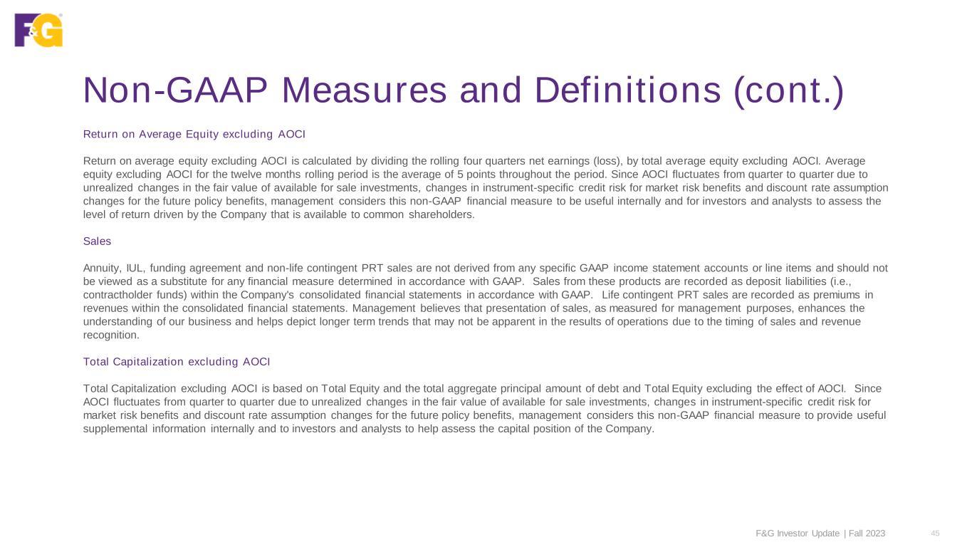 Non-GAAP Measures and Definitions (cont.) F&G Investor Update | Fall 2023 45 Return on Average Equity excluding AOCI Return on average equity excluding AOCI is calculated by dividing the rolling four quarters net earnings (loss), by total average equity excluding AOCI. Average equity excluding AOCI for the twelve months rolling period is the average of 5 points throughout the period. Since AOCI fluctuates from quarter to quarter due to unrealized changes in the fair value of available for sale investments, changes in instrument-specific credit risk for market risk benefits and discount rate assumption changes for the future policy benefits, management considers this non-GAAP financial measure to be useful internally and for investors and analysts to assess the level of return driven by the Company that is available to common shareholders. Sales Annuity, IUL, funding agreement and non-life contingent PRT sales are not derived from any specific GAAP income statement accounts or line items and should not be viewed as a substitute for any financial measure determined in accordance with GAAP. Sales from these products are recorded as deposit liabilities (i.e., contractholder funds) within the Company's consolidated financial statements in accordance with GAAP. Life contingent PRT sales are recorded as premiums in revenues within the consolidated financial statements. Management believes that presentation of sales, as measured for management purposes, enhances the understanding of our business and helps depict longer term trends that may not be apparent in the results of operations due to the timing of sales and revenue recognition. Total Capitalization excluding AOCI Total Capitalization excluding AOCI is based on Total Equity and the total aggregate principal amount of debt and Total Equity excluding the effect of AOCI. Since AOCI fluctuates from quarter to quarter due to unrealized changes in the fair value of available for sale investments, changes in instrument-specific credit risk for market risk benefits and discount rate assumption changes for the future policy benefits, management considers this non-GAAP financial measure to provide useful supplemental information internally and to investors and analysts to help assess the capital position of the Company.