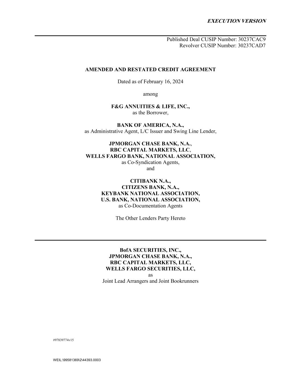 EXECUTION VERSION #97839774v15 WEIL:\99581369\2\44393.0003 Published Deal CUSIP Number: 30237CAC9 Revolver CUSIP Number: 30237CAD7 AMENDED AND RESTATED CREDIT AGREEMENT Dated as of February 16, 2024 among F&G ANNUITIES & LIFE, INC., as the Borrower, BANK OF AMERICA, N.A., as Administrative Agent, L/C Issuer and Swing Line Lender, JPMORGAN CHASE BANK, N.A., RBC CAPITAL MARKETS, LLC, WELLS FARGO BANK, NATIONAL ASSOCIATION, as Co-Syndication Agents, and CITIBANK N.A., CITIZENS BANK, N.A., KEYBANK NATIONAL ASSOCIATION, U.S. BANK, NATIONAL ASSOCIATION, as Co-Documentation Agents The Other Lenders Party Hereto BofA SECURITIES, INC., JPMORGAN CHASE BANK, N.A., RBC CAPITAL MARKETS, LLC, WELLS FARGO SECURITIES, LLC, as Joint Lead Arrangers and Joint Bookrunners