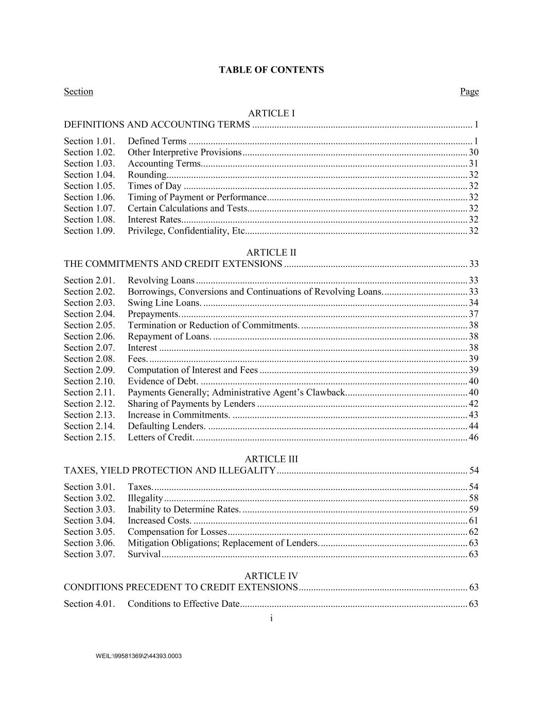 i WEIL:\99581369\2\44393.0003 TABLE OF CONTENTS Section Page ARTICLE I DEFINITIONS AND ACCOUNTING TERMS .......................................................................................... 1 Section 1.01. Defined Terms .................................................................................................................... 1 Section 1.02. Other Interpretive Provisions ............................................................................................ 30 Section 1.03. Accounting Terms. ............................................................................................................ 31 Section 1.04. Rounding ........................................................................................................................... 32 Section 1.05. Times of Day .................................................................................................................... 32 Section 1.06. Timing of Payment or Performance .................................................................................. 32 Section 1.07. Certain Calculations and Tests.......................................................................................... 32 Section 1.08. Interest Rates ..................................................................................................................... 32 Section 1.09. Privilege, Confidentiality, Etc........................................................................................... 32 ARTICLE II THE COMMITMENTS AND CREDIT EXTENSIONS ........................................................................... 33 Section 2.01. Revolving Loans ............................................................................................................... 33 Section 2.02. Borrowings, Conversions and Continuations of Revolving Loans. .................................. 33 Section 2.03. Swing Line Loans. ............................................................................................................ 34 Section 2.04. Prepayments. ..................................................................................................................... 37 Section 2.05. Termination or Reduction of Commitments. .................................................................... 38 Section 2.06. Repayment of Loans. ........................................................................................................ 38 Section 2.07. Interest .............................................................................................................................. 38 Section 2.08. Fees. .................................................................................................................................. 39 Section 2.09. Computation of Interest and Fees ..................................................................................... 39 Section 2.10. Evidence of Debt. ............................................................................................................. 40 Section 2.11. Payments Generally; Administrative Agent’s Clawback. ................................................. 40 Section 2.12. Sharing of Payments by Lenders ...................................................................................... 42 Section 2.13. Increase in Commitments. ................................................................................................ 43 Section 2.14. Defaulting Lenders. .......................................................................................................... 44 Section 2.15. Letters of Credit. ............................................................................................................... 46 ARTICLE III TAXES, YIELD PROTECTION AND ILLEGALITY .............................................................................. 54 Section 3.01. Taxes. ................................................................................................................................ 54 Section 3.02. Illegality ............................................................................................................................ 58 Section 3.03. Inability to Determine Rates. ............................................................................................ 59 Section 3.04. Increased Costs. ................................................................................................................ 61 Section 3.05. Compensation for Losses .................................................................................................. 62 Section 3.06. Mitigation Obligations; Replacement of Lenders. ............................................................ 63 Section 3.07. Survival ............................................................................................................................. 63 ARTICLE IV CONDITIONS PRECEDENT TO CREDIT EXTENSIONS ..................................................................... 63 Section 4.01. Conditions to Effective Date ............................................................................................. 63