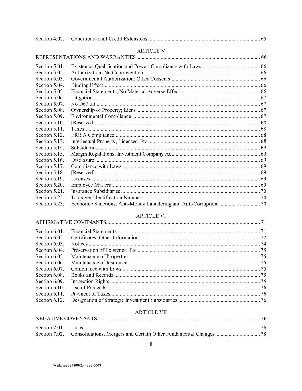 ii WEIL:\99581369\2\44393.0003 Section 4.02. Conditions to all Credit Extensions .................................................................................. 65 ARTICLE V REPRESENTATIONS AND WARRANTIES ........................................................................................... 66 Section 5.01. Existence, Qualification and Power; Compliance with Laws ........................................... 66 Section 5.02. Authorization; No Contravention ..................................................................................... 66 Section 5.03. Governmental Authorization; Other Consents .................................................................. 66 Section 5.04. Binding Effect ................................................................................................................... 66 Section 5.05. Financial Statements; No Material Adverse Effect........................................................... 66 Section 5.06. Litigation ........................................................................................................................... 67 Section 5.07. No Default......................................................................................................................... 67 Section 5.08. Ownership of Property; Liens ........................................................................................... 67 Section 5.09. Environmental Compliance .............................................................................................. 67 Section 5.10. [Reserved]. ........................................................................................................................ 68 Section 5.11. Taxes ................................................................................................................................. 68 Section 5.12. ERISA Compliance ........................................................................................................... 68 Section 5.13. Intellectual Property, Licenses, Etc .................................................................................. 68 Section 5.14. Subsidiaries ....................................................................................................................... 69 Section 5.15. Margin Regulations; Investment Company Act................................................................ 69 Section 5.16. Disclosure ......................................................................................................................... 69 Section 5.17. Compliance with Laws ..................................................................................................... 69 Section 5.18. [Reserved]. ........................................................................................................................ 69 Section 5.19. Licenses ............................................................................................................................ 69 Section 5.20. Employee Matters ............................................................................................................. 69 Section 5.21. Insurance Subsidiaries ...................................................................................................... 70 Section 5.22. Taxpayer Identification Number ....................................................................................... 70 Section 5.23. Economic Sanctions, Anti-Money Laundering and Anti-Corruption. .............................. 70 ARTICLE VI AFFIRMATIVE COVENANTS................................................................................................................. 71 Section 6.01. Financial Statements ......................................................................................................... 71 Section 6.02. Certificates; Other Information ......................................................................................... 72 Section 6.03. Notices .............................................................................................................................. 74 Section 6.04. Preservation of Existence, Etc .......................................................................................... 75 Section 6.05. Maintenance of Properties ................................................................................................ 75 Section 6.06. Maintenance of Insurance ................................................................................................. 75 Section 6.07. Compliance with Laws ..................................................................................................... 75 Section 6.08. Books and Records ........................................................................................................... 75 Section 6.09. Inspection Rights .............................................................................................................. 75 Section 6.10. Use of Proceeds ................................................................................................................ 76 Section 6.11. Payment of Taxes .............................................................................................................. 76 Section 6.12. Designation of Strategic Investment Subsidiaries ............................................................ 76 ARTICLE VII NEGATIVE COVENANTS ....................................................................................................................... 76 Section 7.01. Liens ................................................................................................................................. 76 Section 7.02. Consolidations, Mergers and Certain Other Fundamental Changes ................................. 78