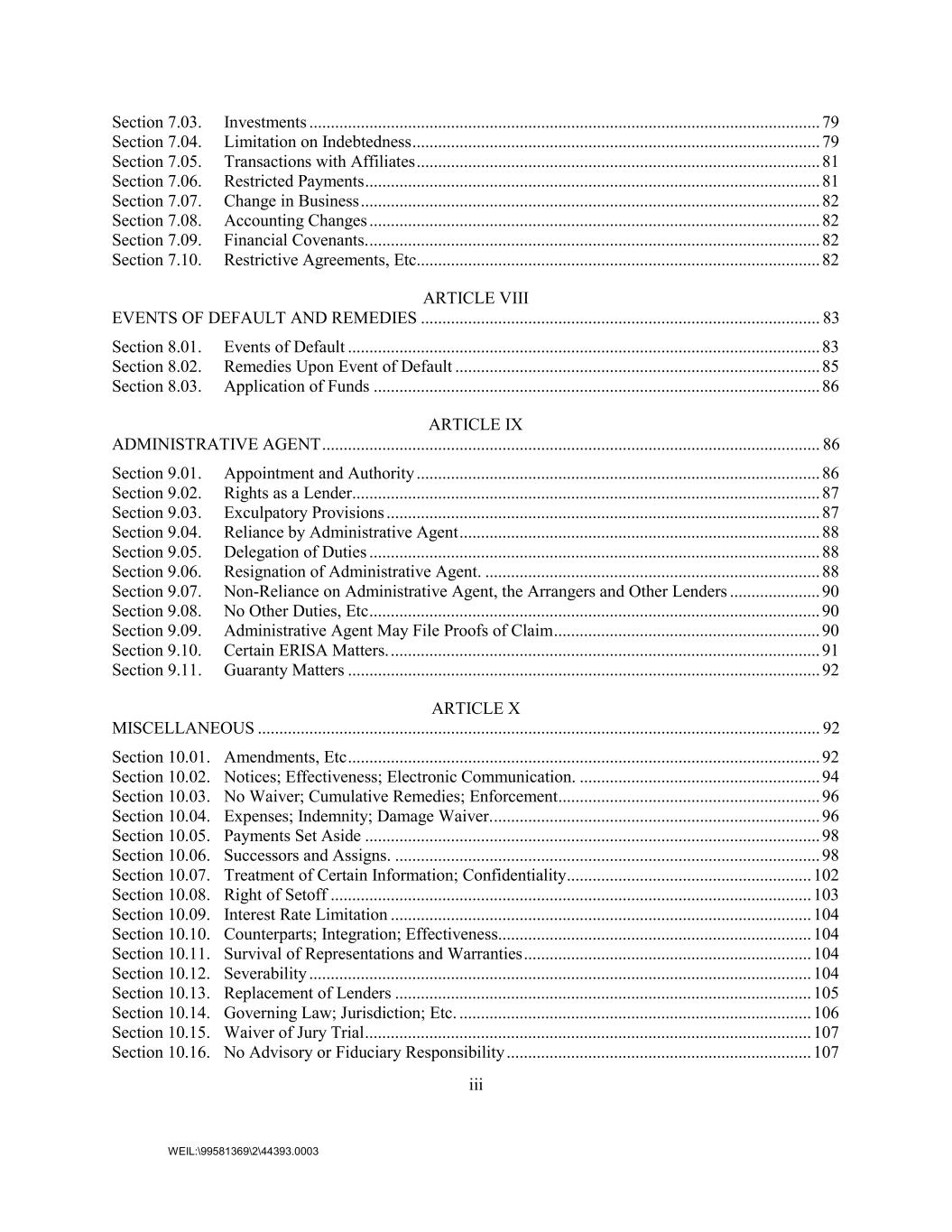 iii WEIL:\99581369\2\44393.0003 Section 7.03. Investments ....................................................................................................................... 79 Section 7.04. Limitation on Indebtedness ............................................................................................... 79 Section 7.05. Transactions with Affiliates .............................................................................................. 81 Section 7.06. Restricted Payments .......................................................................................................... 81 Section 7.07. Change in Business ........................................................................................................... 82 Section 7.08. Accounting Changes ......................................................................................................... 82 Section 7.09. Financial Covenants. ......................................................................................................... 82 Section 7.10. Restrictive Agreements, Etc.............................................................................................. 82 ARTICLE VIII EVENTS OF DEFAULT AND REMEDIES ............................................................................................. 83 Section 8.01. Events of Default .............................................................................................................. 83 Section 8.02. Remedies Upon Event of Default ..................................................................................... 85 Section 8.03. Application of Funds ........................................................................................................ 86 ARTICLE IX ADMINISTRATIVE AGENT .................................................................................................................... 86 Section 9.01. Appointment and Authority .............................................................................................. 86 Section 9.02. Rights as a Lender ............................................................................................................. 87 Section 9.03. Exculpatory Provisions ..................................................................................................... 87 Section 9.04. Reliance by Administrative Agent .................................................................................... 88 Section 9.05. Delegation of Duties ......................................................................................................... 88 Section 9.06. Resignation of Administrative Agent. .............................................................................. 88 Section 9.07. Non-Reliance on Administrative Agent, the Arrangers and Other Lenders ..................... 90 Section 9.08. No Other Duties, Etc ......................................................................................................... 90 Section 9.09. Administrative Agent May File Proofs of Claim .............................................................. 90 Section 9.10. Certain ERISA Matters. .................................................................................................... 91 Section 9.11. Guaranty Matters .............................................................................................................. 92 ARTICLE X MISCELLANEOUS ................................................................................................................................... 92 Section 10.01. Amendments, Etc .............................................................................................................. 92 Section 10.02. Notices; Effectiveness; Electronic Communication. ........................................................ 94 Section 10.03. No Waiver; Cumulative Remedies; Enforcement ............................................................. 96 Section 10.04. Expenses; Indemnity; Damage Waiver. ............................................................................ 96 Section 10.05. Payments Set Aside .......................................................................................................... 98 Section 10.06. Successors and Assigns. ................................................................................................... 98 Section 10.07. Treatment of Certain Information; Confidentiality ......................................................... 102 Section 10.08. Right of Setoff ................................................................................................................ 103 Section 10.09. Interest Rate Limitation .................................................................................................. 104 Section 10.10. Counterparts; Integration; Effectiveness ......................................................................... 104 Section 10.11. Survival of Representations and Warranties ................................................................... 104 Section 10.12. Severability ..................................................................................................................... 104 Section 10.13. Replacement of Lenders ................................................................................................. 105 Section 10.14. Governing Law; Jurisdiction; Etc. .................................................................................. 106 Section 10.15. Waiver of Jury Trial ........................................................................................................ 107 Section 10.16. No Advisory or Fiduciary Responsibility ....................................................................... 107
