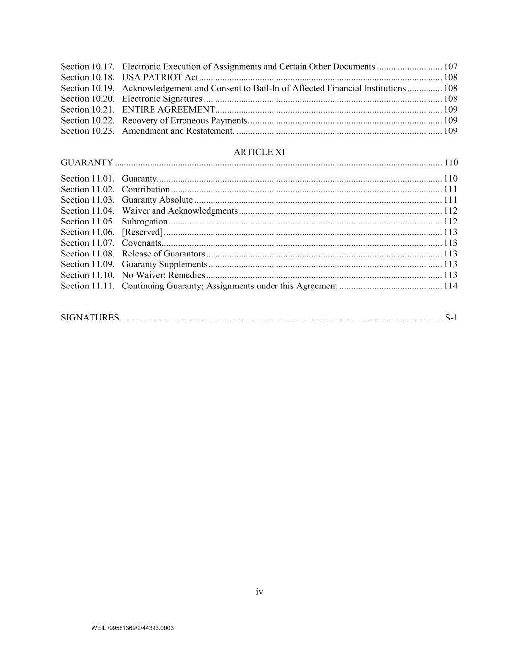 iv WEIL:\99581369\2\44393.0003 Section 10.17. Electronic Execution of Assignments and Certain Other Documents ............................ 107 Section 10.18. USA PATRIOT Act ........................................................................................................ 108 Section 10.19. Acknowledgement and Consent to Bail-In of Affected Financial Institutions ............... 108 Section 10.20. Electronic Signatures ...................................................................................................... 108 Section 10.21. ENTIRE AGREEMENT ................................................................................................. 109 Section 10.22. Recovery of Erroneous Payments. .................................................................................. 109 Section 10.23. Amendment and Restatement. ........................................................................................ 109 ARTICLE XI GUARANTY ............................................................................................................................................ 110 Section 11.01. Guaranty.......................................................................................................................... 110 Section 11.02. Contribution .................................................................................................................... 111 Section 11.03. Guaranty Absolute .......................................................................................................... 111 Section 11.04. Waiver and Acknowledgments ....................................................................................... 112 Section 11.05. Subrogation ..................................................................................................................... 112 Section 11.06. [Reserved]. ...................................................................................................................... 113 Section 11.07. Covenants........................................................................................................................ 113 Section 11.08. Release of Guarantors ..................................................................................................... 113 Section 11.09. Guaranty Supplements .................................................................................................... 113 Section 11.10. No Waiver; Remedies ..................................................................................................... 113 Section 11.11. Continuing Guaranty; Assignments under this Agreement ............................................ 114 SIGNATURES ........................................................................................................................................... S-1
