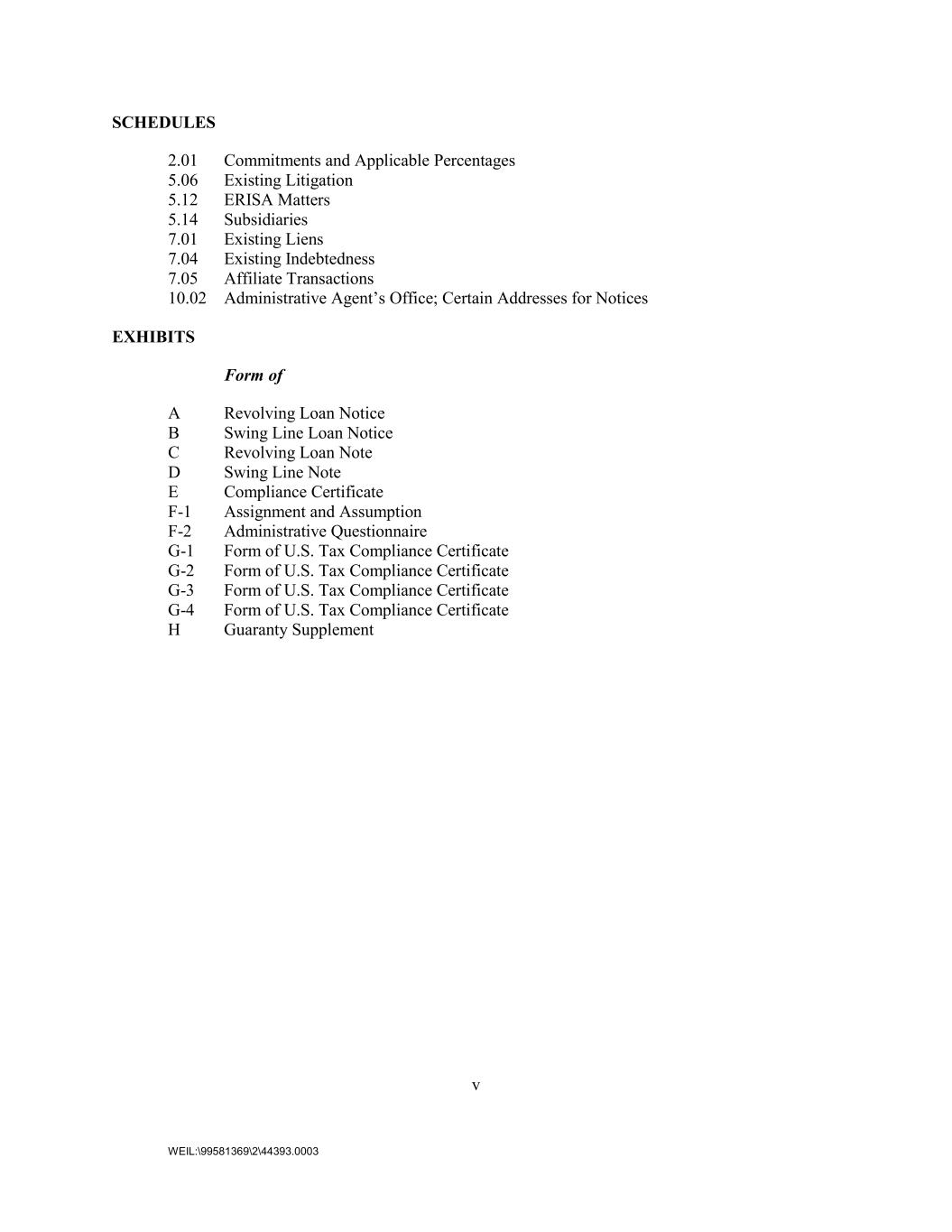 v WEIL:\99581369\2\44393.0003 SCHEDULES 2.01 Commitments and Applicable Percentages 5.06 Existing Litigation 5.12 ERISA Matters 5.14 Subsidiaries 7.01 Existing Liens 7.04 Existing Indebtedness 7.05 Affiliate Transactions 10.02 Administrative Agent’s Office; Certain Addresses for Notices EXHIBITS Form of A Revolving Loan Notice B Swing Line Loan Notice C Revolving Loan Note D Swing Line Note E Compliance Certificate F-1 Assignment and Assumption F-2 Administrative Questionnaire G-1 Form of U.S. Tax Compliance Certificate G-2 Form of U.S. Tax Compliance Certificate G-3 Form of U.S. Tax Compliance Certificate G-4 Form of U.S. Tax Compliance Certificate H Guaranty Supplement
