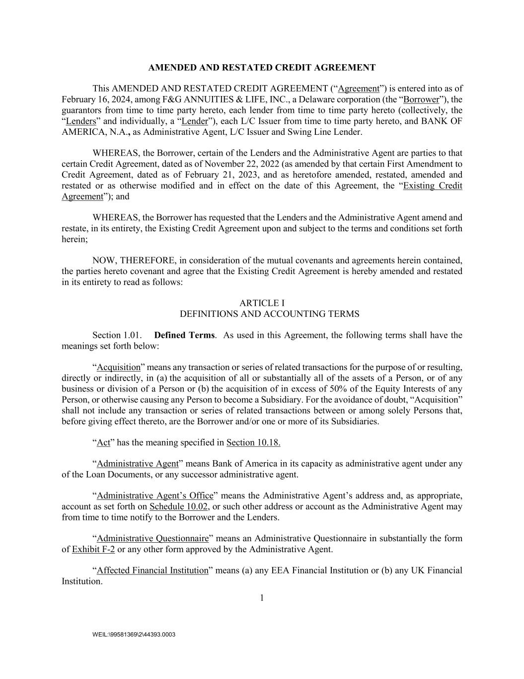1 WEIL:\99581369\2\44393.0003 AMENDED AND RESTATED CREDIT AGREEMENT This AMENDED AND RESTATED CREDIT AGREEMENT (“Agreement”) is entered into as of February 16, 2024, among F&G ANNUITIES & LIFE, INC., a Delaware corporation (the “Borrower”), the guarantors from time to time party hereto, each lender from time to time party hereto (collectively, the “Lenders” and individually, a “Lender”), each L/C Issuer from time to time party hereto, and BANK OF AMERICA, N.A., as Administrative Agent, L/C Issuer and Swing Line Lender. WHEREAS, the Borrower, certain of the Lenders and the Administrative Agent are parties to that certain Credit Agreement, dated as of November 22, 2022 (as amended by that certain First Amendment to Credit Agreement, dated as of February 21, 2023, and as heretofore amended, restated, amended and restated or as otherwise modified and in effect on the date of this Agreement, the “Existing Credit Agreement”); and WHEREAS, the Borrower has requested that the Lenders and the Administrative Agent amend and restate, in its entirety, the Existing Credit Agreement upon and subject to the terms and conditions set forth herein; NOW, THEREFORE, in consideration of the mutual covenants and agreements herein contained, the parties hereto covenant and agree that the Existing Credit Agreement is hereby amended and restated in its entirety to read as follows: ARTICLE I DEFINITIONS AND ACCOUNTING TERMS Section 1.01. Defined Terms. As used in this Agreement, the following terms shall have the meanings set forth below: “Acquisition” means any transaction or series of related transactions for the purpose of or resulting, directly or indirectly, in (a) the acquisition of all or substantially all of the assets of a Person, or of any business or division of a Person or (b) the acquisition of in excess of 50% of the Equity Interests of any Person, or otherwise causing any Person to become a Subsidiary. For the avoidance of doubt, “Acquisition” shall not include any transaction or series of related transactions between or among solely Persons that, before giving effect thereto, are the Borrower and/or one or more of its Subsidiaries. “Act” has the meaning specified in Section 10.18. “Administrative Agent” means Bank of America in its capacity as administrative agent under any of the Loan Documents, or any successor administrative agent. “Administrative Agent’s Office” means the Administrative Agent’s address and, as appropriate, account as set forth on Schedule 10.02, or such other address or account as the Administrative Agent may from time to time notify to the Borrower and the Lenders. “Administrative Questionnaire” means an Administrative Questionnaire in substantially the form of Exhibit F-2 or any other form approved by the Administrative Agent. “Affected Financial Institution” means (a) any EEA Financial Institution or (b) any UK Financial Institution.