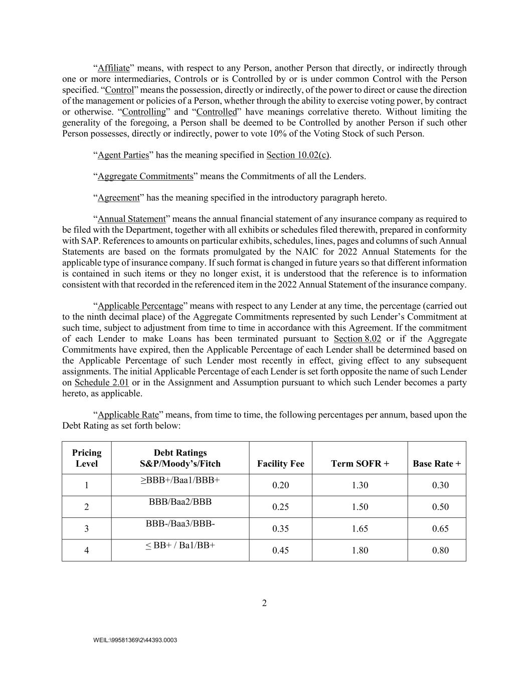2 WEIL:\99581369\2\44393.0003 “Affiliate” means, with respect to any Person, another Person that directly, or indirectly through one or more intermediaries, Controls or is Controlled by or is under common Control with the Person specified. “Control” means the possession, directly or indirectly, of the power to direct or cause the direction of the management or policies of a Person, whether through the ability to exercise voting power, by contract or otherwise. “Controlling” and “Controlled” have meanings correlative thereto. Without limiting the generality of the foregoing, a Person shall be deemed to be Controlled by another Person if such other Person possesses, directly or indirectly, power to vote 10% of the Voting Stock of such Person. “Agent Parties” has the meaning specified in Section 10.02(c). “Aggregate Commitments” means the Commitments of all the Lenders. “Agreement” has the meaning specified in the introductory paragraph hereto. “Annual Statement” means the annual financial statement of any insurance company as required to be filed with the Department, together with all exhibits or schedules filed therewith, prepared in conformity with SAP. References to amounts on particular exhibits, schedules, lines, pages and columns of such Annual Statements are based on the formats promulgated by the NAIC for 2022 Annual Statements for the applicable type of insurance company. If such format is changed in future years so that different information is contained in such items or they no longer exist, it is understood that the reference is to information consistent with that recorded in the referenced item in the 2022 Annual Statement of the insurance company. “Applicable Percentage” means with respect to any Lender at any time, the percentage (carried out to the ninth decimal place) of the Aggregate Commitments represented by such Lender’s Commitment at such time, subject to adjustment from time to time in accordance with this Agreement. If the commitment of each Lender to make Loans has been terminated pursuant to Section 8.02 or if the Aggregate Commitments have expired, then the Applicable Percentage of each Lender shall be determined based on the Applicable Percentage of such Lender most recently in effect, giving effect to any subsequent assignments. The initial Applicable Percentage of each Lender is set forth opposite the name of such Lender on Schedule 2.01 or in the Assignment and Assumption pursuant to which such Lender becomes a party hereto, as applicable. “Applicable Rate” means, from time to time, the following percentages per annum, based upon the Debt Rating as set forth below: Pricing Level Debt Ratings S&P/Moody’s/Fitch Facility Fee Term SOFR + Base Rate + 1 ≥BBB+/Baa1/BBB+ 0.20 1.30 0.30 2 BBB/Baa2/BBB 0.25 1.50 0.50 3 BBB-/Baa3/BBB- 0.35 1.65 0.65 4 < BB+ / Ba1/BB+ 0.45 1.80 0.80