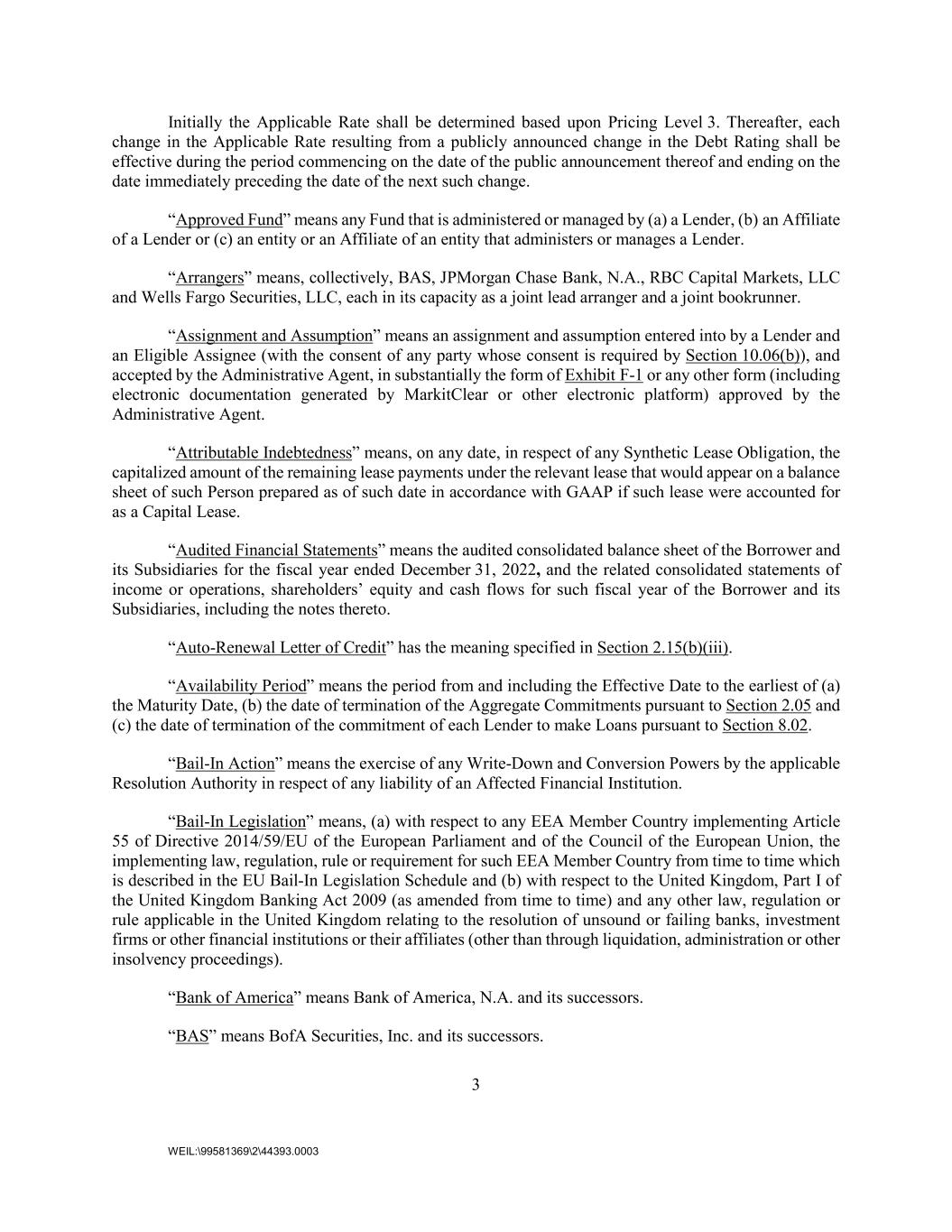 3 WEIL:\99581369\2\44393.0003 Initially the Applicable Rate shall be determined based upon Pricing Level 3. Thereafter, each change in the Applicable Rate resulting from a publicly announced change in the Debt Rating shall be effective during the period commencing on the date of the public announcement thereof and ending on the date immediately preceding the date of the next such change. “Approved Fund” means any Fund that is administered or managed by (a) a Lender, (b) an Affiliate of a Lender or (c) an entity or an Affiliate of an entity that administers or manages a Lender. “Arrangers” means, collectively, BAS, JPMorgan Chase Bank, N.A., RBC Capital Markets, LLC and Wells Fargo Securities, LLC, each in its capacity as a joint lead arranger and a joint bookrunner. “Assignment and Assumption” means an assignment and assumption entered into by a Lender and an Eligible Assignee (with the consent of any party whose consent is required by Section 10.06(b)), and accepted by the Administrative Agent, in substantially the form of Exhibit F-1 or any other form (including electronic documentation generated by MarkitClear or other electronic platform) approved by the Administrative Agent. “Attributable Indebtedness” means, on any date, in respect of any Synthetic Lease Obligation, the capitalized amount of the remaining lease payments under the relevant lease that would appear on a balance sheet of such Person prepared as of such date in accordance with GAAP if such lease were accounted for as a Capital Lease. “Audited Financial Statements” means the audited consolidated balance sheet of the Borrower and its Subsidiaries for the fiscal year ended December 31, 2022, and the related consolidated statements of income or operations, shareholders’ equity and cash flows for such fiscal year of the Borrower and its Subsidiaries, including the notes thereto. “Auto-Renewal Letter of Credit” has the meaning specified in Section 2.15(b)(iii). “Availability Period” means the period from and including the Effective Date to the earliest of (a) the Maturity Date, (b) the date of termination of the Aggregate Commitments pursuant to Section 2.05 and (c) the date of termination of the commitment of each Lender to make Loans pursuant to Section 8.02. “Bail-In Action” means the exercise of any Write-Down and Conversion Powers by the applicable Resolution Authority in respect of any liability of an Affected Financial Institution. “Bail-In Legislation” means, (a) with respect to any EEA Member Country implementing Article 55 of Directive 2014/59/EU of the European Parliament and of the Council of the European Union, the implementing law, regulation, rule or requirement for such EEA Member Country from time to time which is described in the EU Bail-In Legislation Schedule and (b) with respect to the United Kingdom, Part I of the United Kingdom Banking Act 2009 (as amended from time to time) and any other law, regulation or rule applicable in the United Kingdom relating to the resolution of unsound or failing banks, investment firms or other financial institutions or their affiliates (other than through liquidation, administration or other insolvency proceedings). “Bank of America” means Bank of America, N.A. and its successors. “BAS” means BofA Securities, Inc. and its successors.