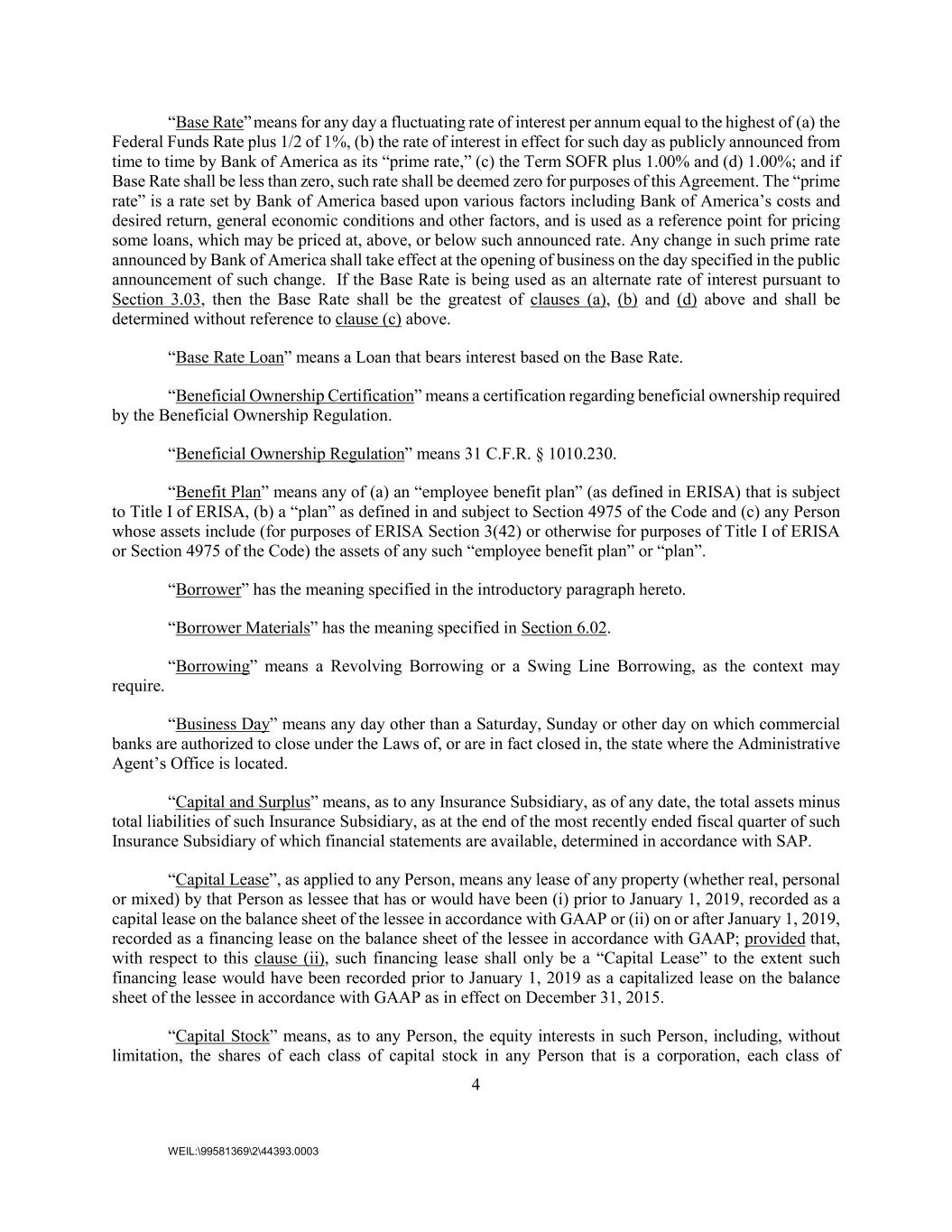 4 WEIL:\99581369\2\44393.0003 “Base Rate” means for any day a fluctuating rate of interest per annum equal to the highest of (a) the Federal Funds Rate plus 1/2 of 1%, (b) the rate of interest in effect for such day as publicly announced from time to time by Bank of America as its “prime rate,” (c) the Term SOFR plus 1.00% and (d) 1.00%; and if Base Rate shall be less than zero, such rate shall be deemed zero for purposes of this Agreement. The “prime rate” is a rate set by Bank of America based upon various factors including Bank of America’s costs and desired return, general economic conditions and other factors, and is used as a reference point for pricing some loans, which may be priced at, above, or below such announced rate. Any change in such prime rate announced by Bank of America shall take effect at the opening of business on the day specified in the public announcement of such change. If the Base Rate is being used as an alternate rate of interest pursuant to Section 3.03, then the Base Rate shall be the greatest of clauses (a), (b) and (d) above and shall be determined without reference to clause (c) above. “Base Rate Loan” means a Loan that bears interest based on the Base Rate. “Beneficial Ownership Certification” means a certification regarding beneficial ownership required by the Beneficial Ownership Regulation. “Beneficial Ownership Regulation” means 31 C.F.R. § 1010.230. “Benefit Plan” means any of (a) an “employee benefit plan” (as defined in ERISA) that is subject to Title I of ERISA, (b) a “plan” as defined in and subject to Section 4975 of the Code and (c) any Person whose assets include (for purposes of ERISA Section 3(42) or otherwise for purposes of Title I of ERISA or Section 4975 of the Code) the assets of any such “employee benefit plan” or “plan”. “Borrower” has the meaning specified in the introductory paragraph hereto. “Borrower Materials” has the meaning specified in Section 6.02. “Borrowing” means a Revolving Borrowing or a Swing Line Borrowing, as the context may require. “Business Day” means any day other than a Saturday, Sunday or other day on which commercial banks are authorized to close under the Laws of, or are in fact closed in, the state where the Administrative Agent’s Office is located. “Capital and Surplus” means, as to any Insurance Subsidiary, as of any date, the total assets minus total liabilities of such Insurance Subsidiary, as at the end of the most recently ended fiscal quarter of such Insurance Subsidiary of which financial statements are available, determined in accordance with SAP. “Capital Lease”, as applied to any Person, means any lease of any property (whether real, personal or mixed) by that Person as lessee that has or would have been (i) prior to January 1, 2019, recorded as a capital lease on the balance sheet of the lessee in accordance with GAAP or (ii) on or after January 1, 2019, recorded as a financing lease on the balance sheet of the lessee in accordance with GAAP; provided that, with respect to this clause (ii), such financing lease shall only be a “Capital Lease” to the extent such financing lease would have been recorded prior to January 1, 2019 as a capitalized lease on the balance sheet of the lessee in accordance with GAAP as in effect on December 31, 2015. “Capital Stock” means, as to any Person, the equity interests in such Person, including, without limitation, the shares of each class of capital stock in any Person that is a corporation, each class of