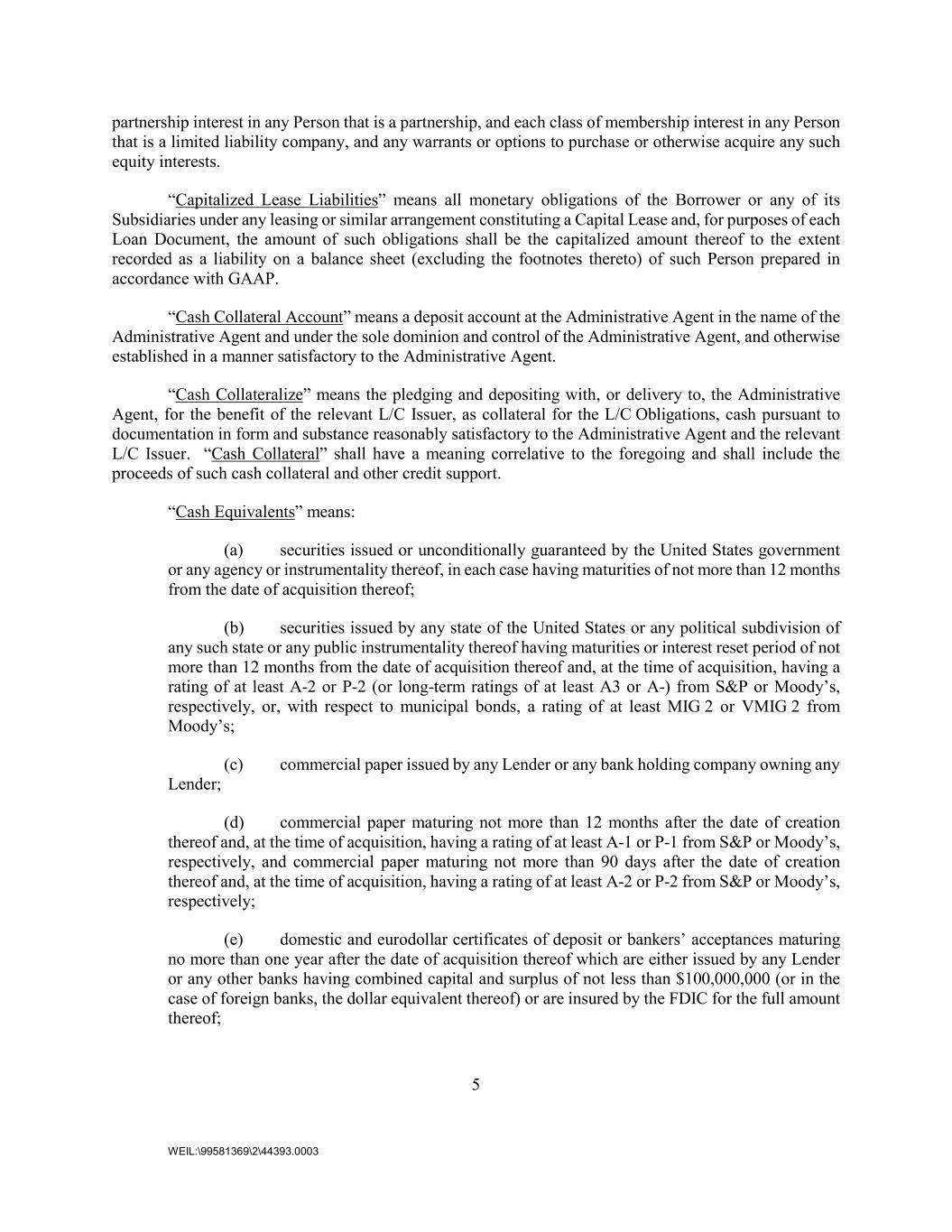 5 WEIL:\99581369\2\44393.0003 partnership interest in any Person that is a partnership, and each class of membership interest in any Person that is a limited liability company, and any warrants or options to purchase or otherwise acquire any such equity interests. “Capitalized Lease Liabilities” means all monetary obligations of the Borrower or any of its Subsidiaries under any leasing or similar arrangement constituting a Capital Lease and, for purposes of each Loan Document, the amount of such obligations shall be the capitalized amount thereof to the extent recorded as a liability on a balance sheet (excluding the footnotes thereto) of such Person prepared in accordance with GAAP. “Cash Collateral Account” means a deposit account at the Administrative Agent in the name of the Administrative Agent and under the sole dominion and control of the Administrative Agent, and otherwise established in a manner satisfactory to the Administrative Agent. “Cash Collateralize” means the pledging and depositing with, or delivery to, the Administrative Agent, for the benefit of the relevant L/C Issuer, as collateral for the L/C Obligations, cash pursuant to documentation in form and substance reasonably satisfactory to the Administrative Agent and the relevant L/C Issuer. “Cash Collateral” shall have a meaning correlative to the foregoing and shall include the proceeds of such cash collateral and other credit support. “Cash Equivalents” means: (a) securities issued or unconditionally guaranteed by the United States government or any agency or instrumentality thereof, in each case having maturities of not more than 12 months from the date of acquisition thereof; (b) securities issued by any state of the United States or any political subdivision of any such state or any public instrumentality thereof having maturities or interest reset period of not more than 12 months from the date of acquisition thereof and, at the time of acquisition, having a rating of at least A-2 or P-2 (or long-term ratings of at least A3 or A-) from S&P or Moody’s, respectively, or, with respect to municipal bonds, a rating of at least MIG 2 or VMIG 2 from Moody’s; (c) commercial paper issued by any Lender or any bank holding company owning any Lender; (d) commercial paper maturing not more than 12 months after the date of creation thereof and, at the time of acquisition, having a rating of at least A-1 or P-1 from S&P or Moody’s, respectively, and commercial paper maturing not more than 90 days after the date of creation thereof and, at the time of acquisition, having a rating of at least A-2 or P-2 from S&P or Moody’s, respectively; (e) domestic and eurodollar certificates of deposit or bankers’ acceptances maturing no more than one year after the date of acquisition thereof which are either issued by any Lender or any other banks having combined capital and surplus of not less than $100,000,000 (or in the case of foreign banks, the dollar equivalent thereof) or are insured by the FDIC for the full amount thereof;