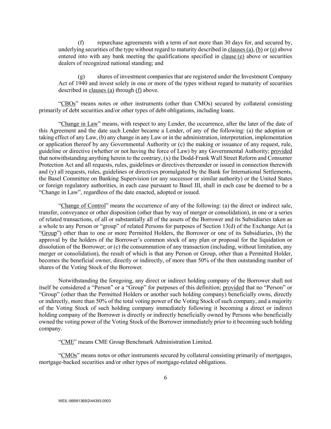 6 WEIL:\99581369\2\44393.0003 (f) repurchase agreements with a term of not more than 30 days for, and secured by, underlying securities of the type without regard to maturity described in clauses (a), (b) or (e) above entered into with any bank meeting the qualifications specified in clause (e) above or securities dealers of recognized national standing; and (g) shares of investment companies that are registered under the Investment Company Act of 1940 and invest solely in one or more of the types without regard to maturity of securities described in clauses (a) through (f) above. “CBOs” means notes or other instruments (other than CMOs) secured by collateral consisting primarily of debt securities and/or other types of debt obligations, including loans. “Change in Law” means, with respect to any Lender, the occurrence, after the later of the date of this Agreement and the date such Lender became a Lender, of any of the following: (a) the adoption or taking effect of any Law, (b) any change in any Law or in the administration, interpretation, implementation or application thereof by any Governmental Authority or (c) the making or issuance of any request, rule, guideline or directive (whether or not having the force of Law) by any Governmental Authority; provided that notwithstanding anything herein to the contrary, (x) the Dodd-Frank Wall Street Reform and Consumer Protection Act and all requests, rules, guidelines or directives thereunder or issued in connection therewith and (y) all requests, rules, guidelines or directives promulgated by the Bank for International Settlements, the Basel Committee on Banking Supervision (or any successor or similar authority) or the United States or foreign regulatory authorities, in each case pursuant to Basel III, shall in each case be deemed to be a “Change in Law”, regardless of the date enacted, adopted or issued. “Change of Control” means the occurrence of any of the following: (a) the direct or indirect sale, transfer, conveyance or other disposition (other than by way of merger or consolidation), in one or a series of related transactions, of all or substantially all of the assets of the Borrower and its Subsidiaries taken as a whole to any Person or “group” of related Persons for purposes of Section 13(d) of the Exchange Act (a “Group”) other than to one or more Permitted Holders, the Borrower or one of its Subsidiaries, (b) the approval by the holders of the Borrower’s common stock of any plan or proposal for the liquidation or dissolution of the Borrower; or (c) the consummation of any transaction (including, without limitation, any merger or consolidation), the result of which is that any Person or Group, other than a Permitted Holder, becomes the beneficial owner, directly or indirectly, of more than 50% of the then outstanding number of shares of the Voting Stock of the Borrower. Notwithstanding the foregoing, any direct or indirect holding company of the Borrower shall not itself be considered a “Person” or a “Group” for purposes of this definition; provided that no “Person” or “Group” (other than the Permitted Holders or another such holding company) beneficially owns, directly or indirectly, more than 50% of the total voting power of the Voting Stock of such company, and a majority of the Voting Stock of such holding company immediately following it becoming a direct or indirect holding company of the Borrower is directly or indirectly beneficially owned by Persons who beneficially owned the voting power of the Voting Stock of the Borrower immediately prior to it becoming such holding company. “CME” means CME Group Benchmark Administration Limited. “CMOs” means notes or other instruments secured by collateral consisting primarily of mortgages, mortgage-backed securities and/or other types of mortgage-related obligations.