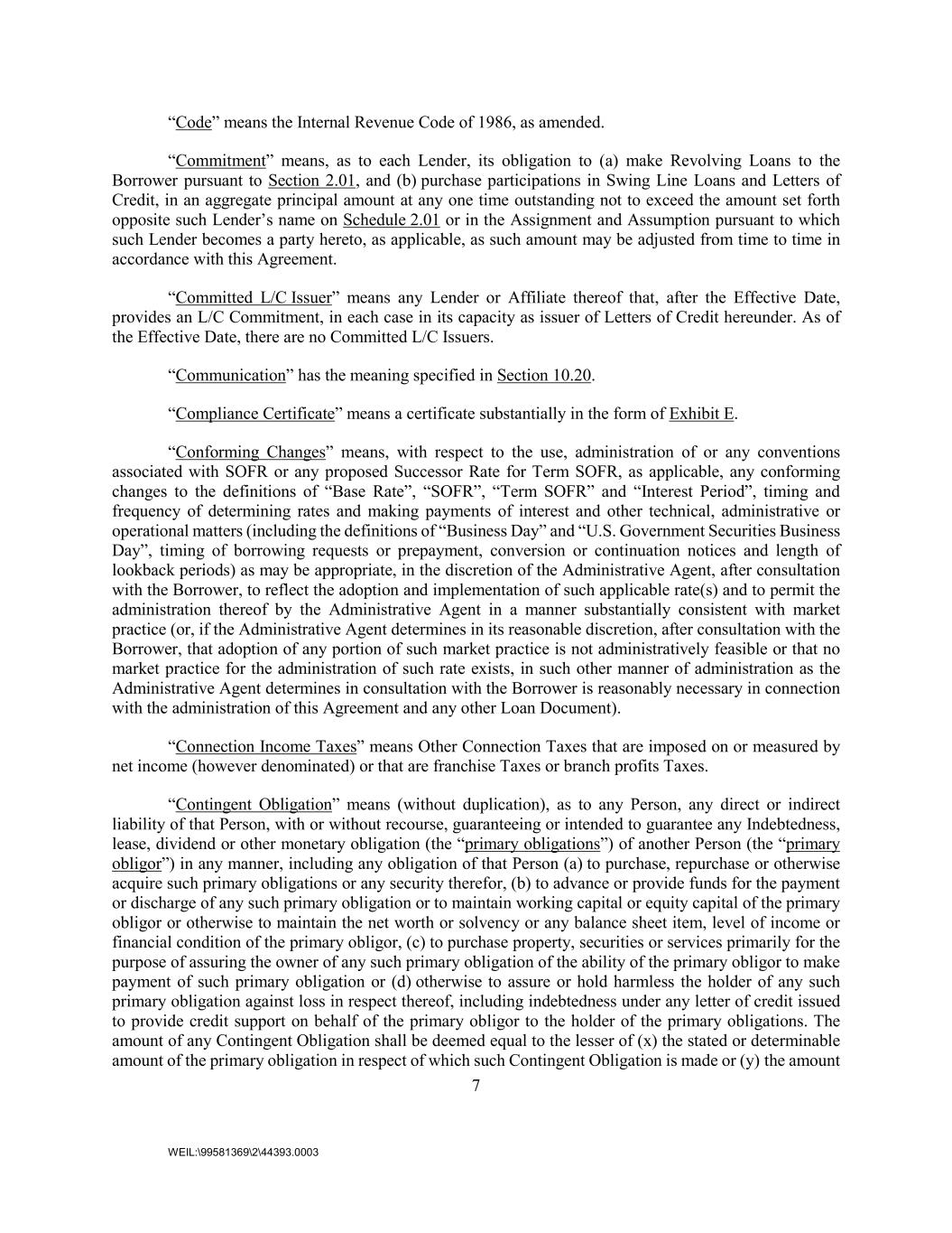 7 WEIL:\99581369\2\44393.0003 “Code” means the Internal Revenue Code of 1986, as amended. “Commitment” means, as to each Lender, its obligation to (a) make Revolving Loans to the Borrower pursuant to Section 2.01, and (b) purchase participations in Swing Line Loans and Letters of Credit, in an aggregate principal amount at any one time outstanding not to exceed the amount set forth opposite such Lender’s name on Schedule 2.01 or in the Assignment and Assumption pursuant to which such Lender becomes a party hereto, as applicable, as such amount may be adjusted from time to time in accordance with this Agreement. “Committed L/C Issuer” means any Lender or Affiliate thereof that, after the Effective Date, provides an L/C Commitment, in each case in its capacity as issuer of Letters of Credit hereunder. As of the Effective Date, there are no Committed L/C Issuers. “Communication” has the meaning specified in Section 10.20. “Compliance Certificate” means a certificate substantially in the form of Exhibit E. “Conforming Changes” means, with respect to the use, administration of or any conventions associated with SOFR or any proposed Successor Rate for Term SOFR, as applicable, any conforming changes to the definitions of “Base Rate”, “SOFR”, “Term SOFR” and “Interest Period”, timing and frequency of determining rates and making payments of interest and other technical, administrative or operational matters (including the definitions of “Business Day” and “U.S. Government Securities Business Day”, timing of borrowing requests or prepayment, conversion or continuation notices and length of lookback periods) as may be appropriate, in the discretion of the Administrative Agent, after consultation with the Borrower, to reflect the adoption and implementation of such applicable rate(s) and to permit the administration thereof by the Administrative Agent in a manner substantially consistent with market practice (or, if the Administrative Agent determines in its reasonable discretion, after consultation with the Borrower, that adoption of any portion of such market practice is not administratively feasible or that no market practice for the administration of such rate exists, in such other manner of administration as the Administrative Agent determines in consultation with the Borrower is reasonably necessary in connection with the administration of this Agreement and any other Loan Document). “Connection Income Taxes” means Other Connection Taxes that are imposed on or measured by net income (however denominated) or that are franchise Taxes or branch profits Taxes. “Contingent Obligation” means (without duplication), as to any Person, any direct or indirect liability of that Person, with or without recourse, guaranteeing or intended to guarantee any Indebtedness, lease, dividend or other monetary obligation (the “primary obligations”) of another Person (the “primary obligor”) in any manner, including any obligation of that Person (a) to purchase, repurchase or otherwise acquire such primary obligations or any security therefor, (b) to advance or provide funds for the payment or discharge of any such primary obligation or to maintain working capital or equity capital of the primary obligor or otherwise to maintain the net worth or solvency or any balance sheet item, level of income or financial condition of the primary obligor, (c) to purchase property, securities or services primarily for the purpose of assuring the owner of any such primary obligation of the ability of the primary obligor to make payment of such primary obligation or (d) otherwise to assure or hold harmless the holder of any such primary obligation against loss in respect thereof, including indebtedness under any letter of credit issued to provide credit support on behalf of the primary obligor to the holder of the primary obligations. The amount of any Contingent Obligation shall be deemed equal to the lesser of (x) the stated or determinable amount of the primary obligation in respect of which such Contingent Obligation is made or (y) the amount