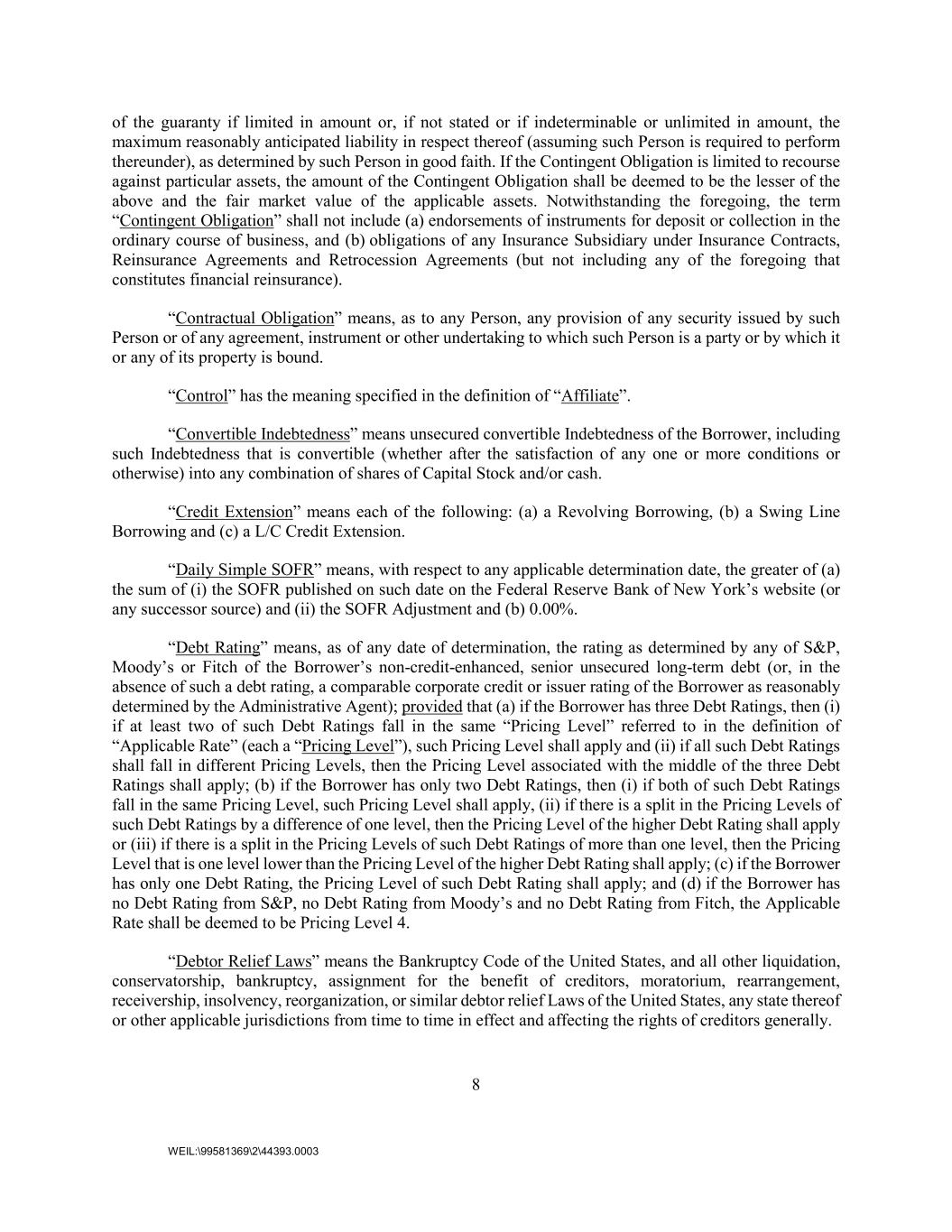 8 WEIL:\99581369\2\44393.0003 of the guaranty if limited in amount or, if not stated or if indeterminable or unlimited in amount, the maximum reasonably anticipated liability in respect thereof (assuming such Person is required to perform thereunder), as determined by such Person in good faith. If the Contingent Obligation is limited to recourse against particular assets, the amount of the Contingent Obligation shall be deemed to be the lesser of the above and the fair market value of the applicable assets. Notwithstanding the foregoing, the term “Contingent Obligation” shall not include (a) endorsements of instruments for deposit or collection in the ordinary course of business, and (b) obligations of any Insurance Subsidiary under Insurance Contracts, Reinsurance Agreements and Retrocession Agreements (but not including any of the foregoing that constitutes financial reinsurance). “Contractual Obligation” means, as to any Person, any provision of any security issued by such Person or of any agreement, instrument or other undertaking to which such Person is a party or by which it or any of its property is bound. “Control” has the meaning specified in the definition of “Affiliate”. “Convertible Indebtedness” means unsecured convertible Indebtedness of the Borrower, including such Indebtedness that is convertible (whether after the satisfaction of any one or more conditions or otherwise) into any combination of shares of Capital Stock and/or cash. “Credit Extension” means each of the following: (a) a Revolving Borrowing, (b) a Swing Line Borrowing and (c) a L/C Credit Extension. “Daily Simple SOFR” means, with respect to any applicable determination date, the greater of (a) the sum of (i) the SOFR published on such date on the Federal Reserve Bank of New York’s website (or any successor source) and (ii) the SOFR Adjustment and (b) 0.00%. “Debt Rating” means, as of any date of determination, the rating as determined by any of S&P, Moody’s or Fitch of the Borrower’s non-credit-enhanced, senior unsecured long-term debt (or, in the absence of such a debt rating, a comparable corporate credit or issuer rating of the Borrower as reasonably determined by the Administrative Agent); provided that (a) if the Borrower has three Debt Ratings, then (i) if at least two of such Debt Ratings fall in the same “Pricing Level” referred to in the definition of “Applicable Rate” (each a “Pricing Level”), such Pricing Level shall apply and (ii) if all such Debt Ratings shall fall in different Pricing Levels, then the Pricing Level associated with the middle of the three Debt Ratings shall apply; (b) if the Borrower has only two Debt Ratings, then (i) if both of such Debt Ratings fall in the same Pricing Level, such Pricing Level shall apply, (ii) if there is a split in the Pricing Levels of such Debt Ratings by a difference of one level, then the Pricing Level of the higher Debt Rating shall apply or (iii) if there is a split in the Pricing Levels of such Debt Ratings of more than one level, then the Pricing Level that is one level lower than the Pricing Level of the higher Debt Rating shall apply; (c) if the Borrower has only one Debt Rating, the Pricing Level of such Debt Rating shall apply; and (d) if the Borrower has no Debt Rating from S&P, no Debt Rating from Moody’s and no Debt Rating from Fitch, the Applicable Rate shall be deemed to be Pricing Level 4. “Debtor Relief Laws” means the Bankruptcy Code of the United States, and all other liquidation, conservatorship, bankruptcy, assignment for the benefit of creditors, moratorium, rearrangement, receivership, insolvency, reorganization, or similar debtor relief Laws of the United States, any state thereof or other applicable jurisdictions from time to time in effect and affecting the rights of creditors generally.