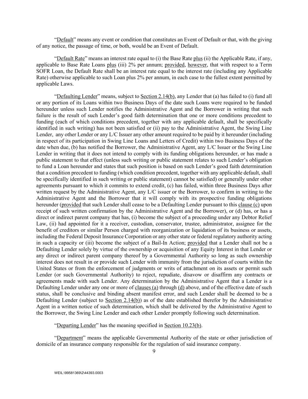 9 WEIL:\99581369\2\44393.0003 “Default” means any event or condition that constitutes an Event of Default or that, with the giving of any notice, the passage of time, or both, would be an Event of Default. “Default Rate” means an interest rate equal to (i) the Base Rate plus (ii) the Applicable Rate, if any, applicable to Base Rate Loans plus (iii) 2% per annum; provided, however, that with respect to a Term SOFR Loan, the Default Rate shall be an interest rate equal to the interest rate (including any Applicable Rate) otherwise applicable to such Loan plus 2% per annum, in each case to the fullest extent permitted by applicable Laws. “Defaulting Lender” means, subject to Section 2.14(b), any Lender that (a) has failed to (i) fund all or any portion of its Loans within two Business Days of the date such Loans were required to be funded hereunder unless such Lender notifies the Administrative Agent and the Borrower in writing that such failure is the result of such Lender’s good faith determination that one or more conditions precedent to funding (each of which conditions precedent, together with any applicable default, shall be specifically identified in such writing) has not been satisfied or (ii) pay to the Administrative Agent, the Swing Line Lender, any other Lender or any L/C Issuer any other amount required to be paid by it hereunder (including in respect of its participation in Swing Line Loans and Letters of Credit) within two Business Days of the date when due, (b) has notified the Borrower, the Administrative Agent, any L/C Issuer or the Swing Line Lender in writing that it does not intend to comply with its funding obligations hereunder, or has made a public statement to that effect (unless such writing or public statement relates to such Lender’s obligation to fund a Loan hereunder and states that such position is based on such Lender’s good faith determination that a condition precedent to funding (which condition precedent, together with any applicable default, shall be specifically identified in such writing or public statement) cannot be satisfied) or generally under other agreements pursuant to which it commits to extend credit, (c) has failed, within three Business Days after written request by the Administrative Agent, any L/C issuer or the Borrower, to confirm in writing to the Administrative Agent and the Borrower that it will comply with its prospective funding obligations hereunder (provided that such Lender shall cease to be a Defaulting Lender pursuant to this clause (c) upon receipt of such written confirmation by the Administrative Agent and the Borrower), or (d) has, or has a direct or indirect parent company that has, (i) become the subject of a proceeding under any Debtor Relief Law, (ii) had appointed for it a receiver, custodian, conservator, trustee, administrator, assignee for the benefit of creditors or similar Person charged with reorganization or liquidation of its business or assets, including the Federal Deposit Insurance Corporation or any other state or federal regulatory authority acting in such a capacity or (iii) become the subject of a Bail-In Action; provided that a Lender shall not be a Defaulting Lender solely by virtue of the ownership or acquisition of any Equity Interest in that Lender or any direct or indirect parent company thereof by a Governmental Authority so long as such ownership interest does not result in or provide such Lender with immunity from the jurisdiction of courts within the United States or from the enforcement of judgments or writs of attachment on its assets or permit such Lender (or such Governmental Authority) to reject, repudiate, disavow or disaffirm any contracts or agreements made with such Lender. Any determination by the Administrative Agent that a Lender is a Defaulting Lender under any one or more of clauses (a) through (d) above, and of the effective date of such status, shall be conclusive and binding absent manifest error, and such Lender shall be deemed to be a Defaulting Lender (subject to Section 2.14(b)) as of the date established therefor by the Administrative Agent in a written notice of such determination, which shall be delivered by the Administrative Agent to the Borrower, the Swing Line Lender and each other Lender promptly following such determination. “Departing Lender” has the meaning specified in Section 10.23(b). “Department” means the applicable Governmental Authority of the state or other jurisdiction of domicile of an insurance company responsible for the regulation of said insurance company.