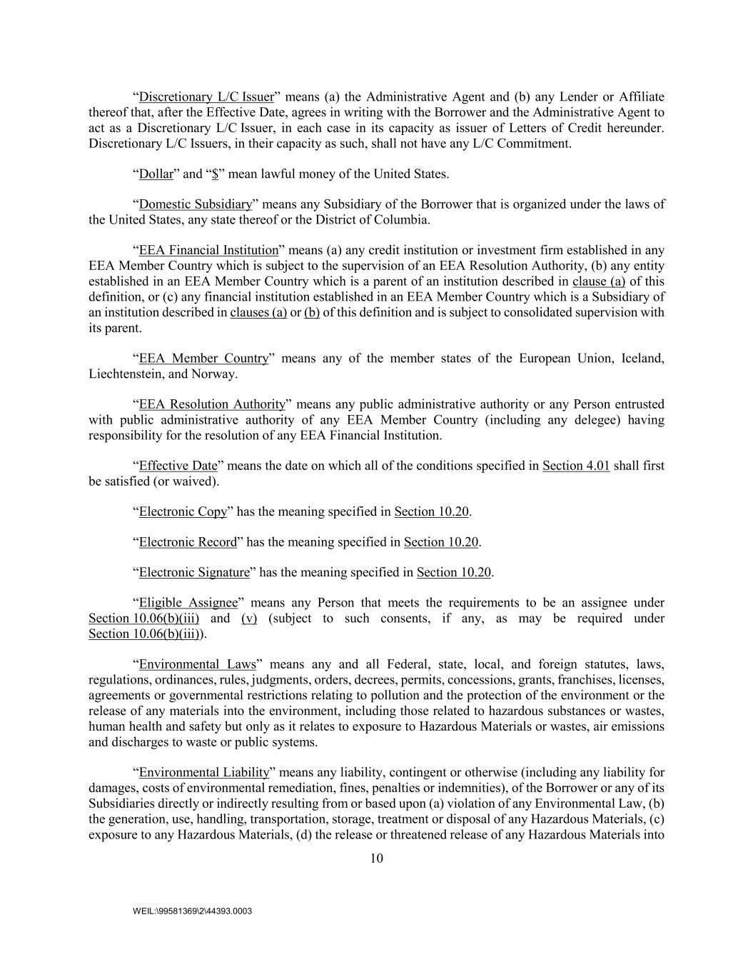 10 WEIL:\99581369\2\44393.0003 “Discretionary L/C Issuer” means (a) the Administrative Agent and (b) any Lender or Affiliate thereof that, after the Effective Date, agrees in writing with the Borrower and the Administrative Agent to act as a Discretionary L/C Issuer, in each case in its capacity as issuer of Letters of Credit hereunder. Discretionary L/C Issuers, in their capacity as such, shall not have any L/C Commitment. “Dollar” and “$” mean lawful money of the United States. “Domestic Subsidiary” means any Subsidiary of the Borrower that is organized under the laws of the United States, any state thereof or the District of Columbia. “EEA Financial Institution” means (a) any credit institution or investment firm established in any EEA Member Country which is subject to the supervision of an EEA Resolution Authority, (b) any entity established in an EEA Member Country which is a parent of an institution described in clause (a) of this definition, or (c) any financial institution established in an EEA Member Country which is a Subsidiary of an institution described in clauses (a) or (b) of this definition and is subject to consolidated supervision with its parent. “EEA Member Country” means any of the member states of the European Union, Iceland, Liechtenstein, and Norway. “EEA Resolution Authority” means any public administrative authority or any Person entrusted with public administrative authority of any EEA Member Country (including any delegee) having responsibility for the resolution of any EEA Financial Institution. “Effective Date” means the date on which all of the conditions specified in Section 4.01 shall first be satisfied (or waived). “Electronic Copy” has the meaning specified in Section 10.20. “Electronic Record” has the meaning specified in Section 10.20. “Electronic Signature” has the meaning specified in Section 10.20. “Eligible Assignee” means any Person that meets the requirements to be an assignee under Section 10.06(b)(iii) and (v) (subject to such consents, if any, as may be required under Section 10.06(b)(iii)). “Environmental Laws” means any and all Federal, state, local, and foreign statutes, laws, regulations, ordinances, rules, judgments, orders, decrees, permits, concessions, grants, franchises, licenses, agreements or governmental restrictions relating to pollution and the protection of the environment or the release of any materials into the environment, including those related to hazardous substances or wastes, human health and safety but only as it relates to exposure to Hazardous Materials or wastes, air emissions and discharges to waste or public systems. “Environmental Liability” means any liability, contingent or otherwise (including any liability for damages, costs of environmental remediation, fines, penalties or indemnities), of the Borrower or any of its Subsidiaries directly or indirectly resulting from or based upon (a) violation of any Environmental Law, (b) the generation, use, handling, transportation, storage, treatment or disposal of any Hazardous Materials, (c) exposure to any Hazardous Materials, (d) the release or threatened release of any Hazardous Materials into