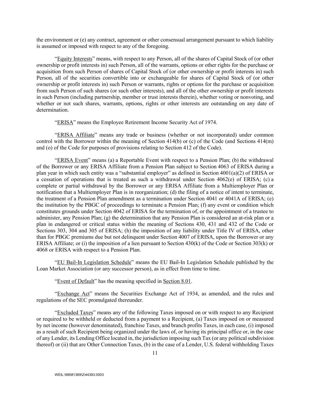 11 WEIL:\99581369\2\44393.0003 the environment or (e) any contract, agreement or other consensual arrangement pursuant to which liability is assumed or imposed with respect to any of the foregoing. “Equity Interests” means, with respect to any Person, all of the shares of Capital Stock of (or other ownership or profit interests in) such Person, all of the warrants, options or other rights for the purchase or acquisition from such Person of shares of Capital Stock of (or other ownership or profit interests in) such Person, all of the securities convertible into or exchangeable for shares of Capital Stock of (or other ownership or profit interests in) such Person or warrants, rights or options for the purchase or acquisition from such Person of such shares (or such other interests), and all of the other ownership or profit interests in such Person (including partnership, member or trust interests therein), whether voting or nonvoting, and whether or not such shares, warrants, options, rights or other interests are outstanding on any date of determination. “ERISA” means the Employee Retirement Income Security Act of 1974. “ERISA Affiliate” means any trade or business (whether or not incorporated) under common control with the Borrower within the meaning of Section 414(b) or (c) of the Code (and Sections 414(m) and (o) of the Code for purposes of provisions relating to Section 412 of the Code). “ERISA Event” means (a) a Reportable Event with respect to a Pension Plan; (b) the withdrawal of the Borrower or any ERISA Affiliate from a Pension Plan subject to Section 4063 of ERISA during a plan year in which such entity was a “substantial employer” as defined in Section 4001(a)(2) of ERISA or a cessation of operations that is treated as such a withdrawal under Section 4062(e) of ERISA; (c) a complete or partial withdrawal by the Borrower or any ERISA Affiliate from a Multiemployer Plan or notification that a Multiemployer Plan is in reorganization; (d) the filing of a notice of intent to terminate, the treatment of a Pension Plan amendment as a termination under Section 4041 or 4041A of ERISA; (e) the institution by the PBGC of proceedings to terminate a Pension Plan; (f) any event or condition which constitutes grounds under Section 4042 of ERISA for the termination of, or the appointment of a trustee to administer, any Pension Plan; (g) the determination that any Pension Plan is considered an at-risk plan or a plan in endangered or critical status within the meaning of Sections 430, 431 and 432 of the Code or Sections 303, 304 and 305 of ERISA; (h) the imposition of any liability under Title IV of ERISA, other than for PBGC premiums due but not delinquent under Section 4007 of ERISA, upon the Borrower or any ERISA Affiliate; or (i) the imposition of a lien pursuant to Section 430(k) of the Code or Section 303(k) or 4068 or ERISA with respect to a Pension Plan. “EU Bail-In Legislation Schedule” means the EU Bail-In Legislation Schedule published by the Loan Market Association (or any successor person), as in effect from time to time. “Event of Default” has the meaning specified in Section 8.01. “Exchange Act” means the Securities Exchange Act of 1934, as amended, and the rules and regulations of the SEC promulgated thereunder. “Excluded Taxes” means any of the following Taxes imposed on or with respect to any Recipient or required to be withheld or deducted from a payment to a Recipient, (a) Taxes imposed on or measured by net income (however denominated), franchise Taxes, and branch profits Taxes, in each case, (i) imposed as a result of such Recipient being organized under the laws of, or having its principal office or, in the case of any Lender, its Lending Office located in, the jurisdiction imposing such Tax (or any political subdivision thereof) or (ii) that are Other Connection Taxes, (b) in the case of a Lender, U.S. federal withholding Taxes