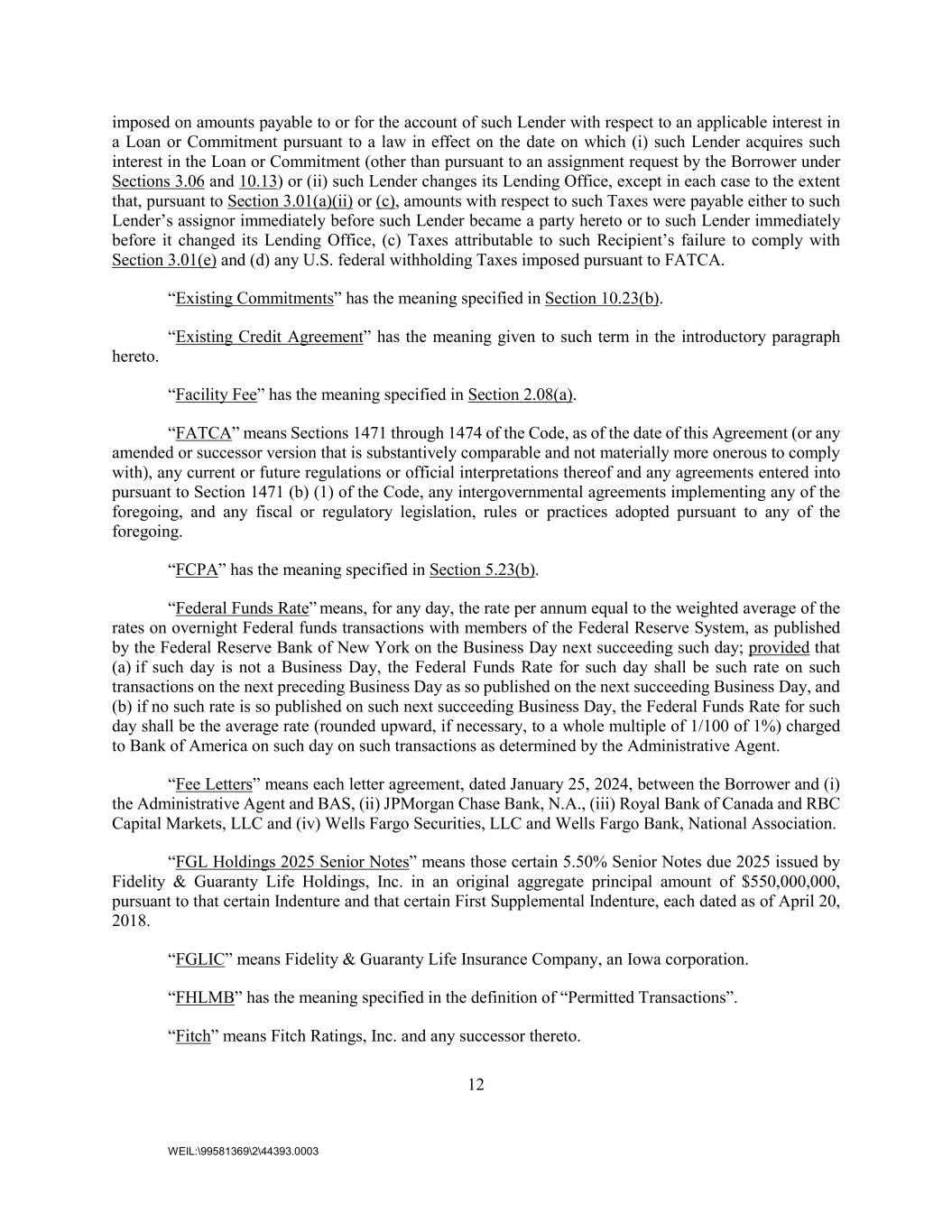 12 WEIL:\99581369\2\44393.0003 imposed on amounts payable to or for the account of such Lender with respect to an applicable interest in a Loan or Commitment pursuant to a law in effect on the date on which (i) such Lender acquires such interest in the Loan or Commitment (other than pursuant to an assignment request by the Borrower under Sections 3.06 and 10.13) or (ii) such Lender changes its Lending Office, except in each case to the extent that, pursuant to Section 3.01(a)(ii) or (c), amounts with respect to such Taxes were payable either to such Lender’s assignor immediately before such Lender became a party hereto or to such Lender immediately before it changed its Lending Office, (c) Taxes attributable to such Recipient’s failure to comply with Section 3.01(e) and (d) any U.S. federal withholding Taxes imposed pursuant to FATCA. “Existing Commitments” has the meaning specified in Section 10.23(b). “Existing Credit Agreement” has the meaning given to such term in the introductory paragraph hereto. “Facility Fee” has the meaning specified in Section 2.08(a). “FATCA” means Sections 1471 through 1474 of the Code, as of the date of this Agreement (or any amended or successor version that is substantively comparable and not materially more onerous to comply with), any current or future regulations or official interpretations thereof and any agreements entered into pursuant to Section 1471 (b) (1) of the Code, any intergovernmental agreements implementing any of the foregoing, and any fiscal or regulatory legislation, rules or practices adopted pursuant to any of the foregoing. “FCPA” has the meaning specified in Section 5.23(b). “Federal Funds Rate” means, for any day, the rate per annum equal to the weighted average of the rates on overnight Federal funds transactions with members of the Federal Reserve System, as published by the Federal Reserve Bank of New York on the Business Day next succeeding such day; provided that (a) if such day is not a Business Day, the Federal Funds Rate for such day shall be such rate on such transactions on the next preceding Business Day as so published on the next succeeding Business Day, and (b) if no such rate is so published on such next succeeding Business Day, the Federal Funds Rate for such day shall be the average rate (rounded upward, if necessary, to a whole multiple of 1/100 of 1%) charged to Bank of America on such day on such transactions as determined by the Administrative Agent. “Fee Letters” means each letter agreement, dated January 25, 2024, between the Borrower and (i) the Administrative Agent and BAS, (ii) JPMorgan Chase Bank, N.A., (iii) Royal Bank of Canada and RBC Capital Markets, LLC and (iv) Wells Fargo Securities, LLC and Wells Fargo Bank, National Association. “FGL Holdings 2025 Senior Notes” means those certain 5.50% Senior Notes due 2025 issued by Fidelity & Guaranty Life Holdings, Inc. in an original aggregate principal amount of $550,000,000, pursuant to that certain Indenture and that certain First Supplemental Indenture, each dated as of April 20, 2018. “FGLIC” means Fidelity & Guaranty Life Insurance Company, an Iowa corporation. “FHLMB” has the meaning specified in the definition of “Permitted Transactions”. “Fitch” means Fitch Ratings, Inc. and any successor thereto.